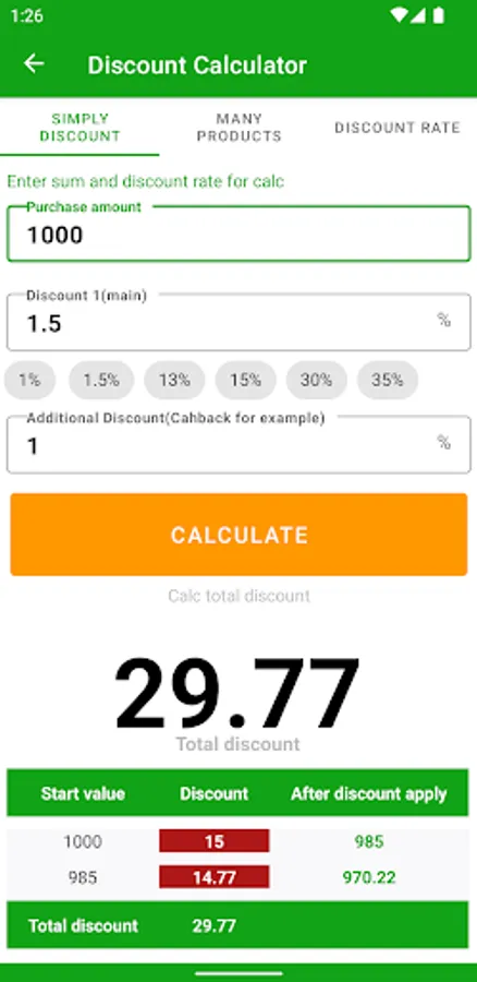 🔸 Simple discount calculation - by one percent or if the discount was double - in the store and on a cashback card.