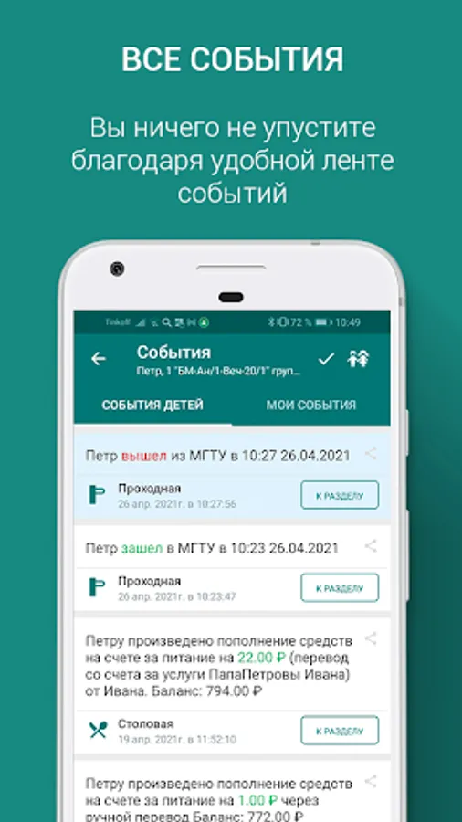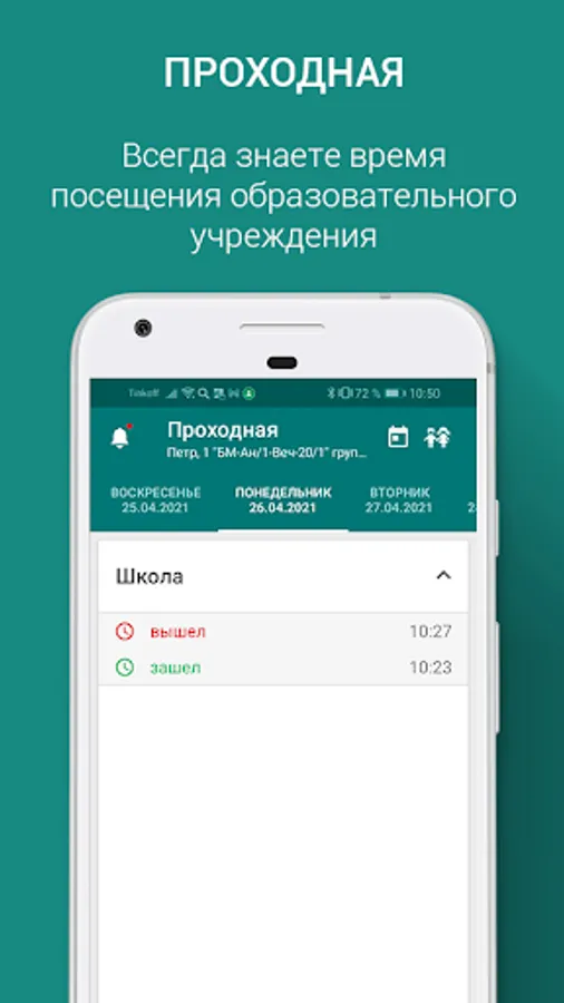 "Checkpoint" - this module enables representatives of students from universities to track student passes through the "Electronic checkpoint" (access control system in an educational institution) and receive push-notifications about each entrance / exit of a student from an educational institution.