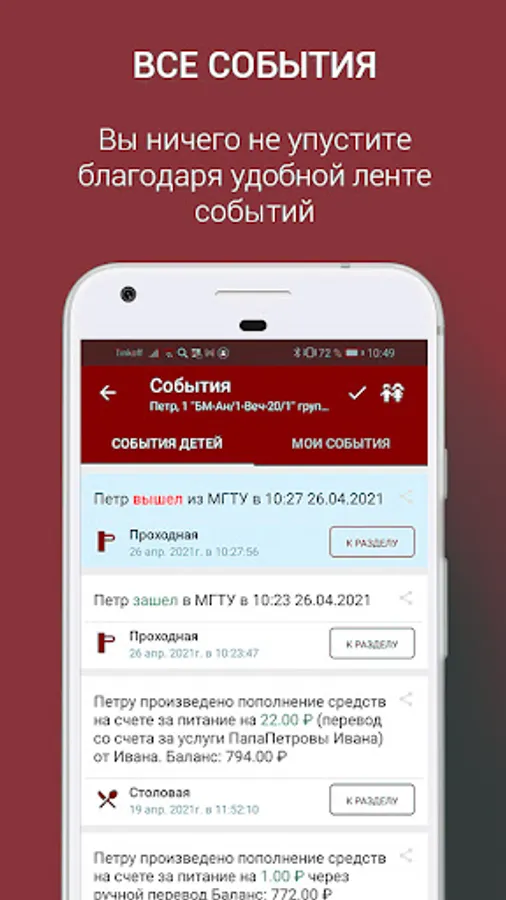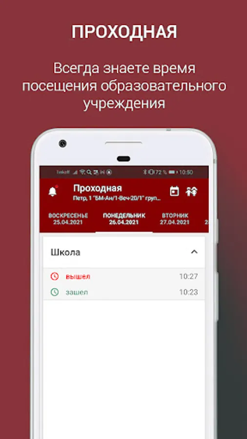 "Checkpoint" - displays the user's passes through the ACS and allows student representatives to track the time of visiting educational buildings and dormitories. Use university parking and manage your own IDs.