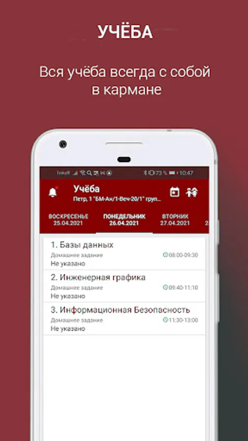 The application consists of the following modules: "Study" - allows you to view information on the educational part: the schedule and attendance of classes, the schedule of tests and exams, study tasks and the curriculum.