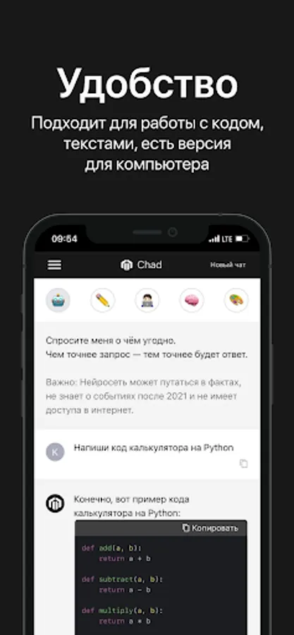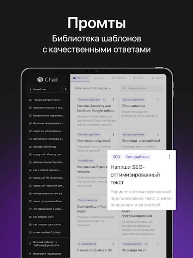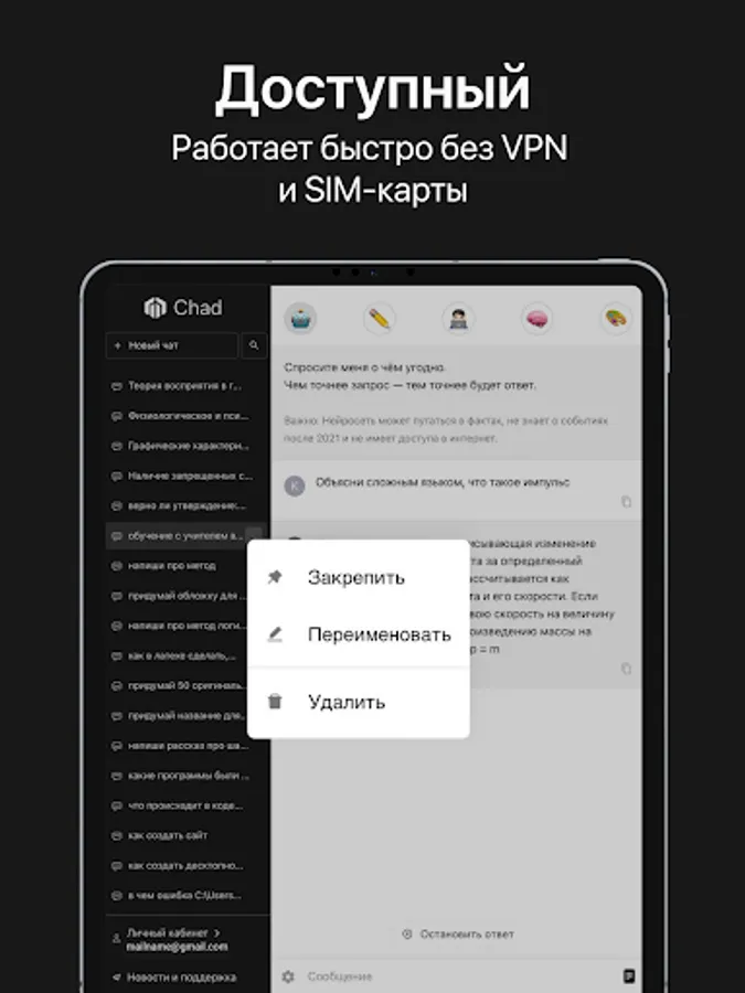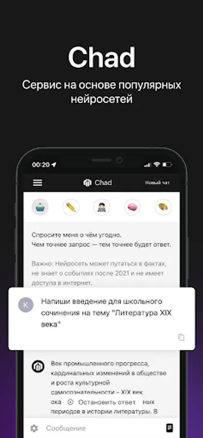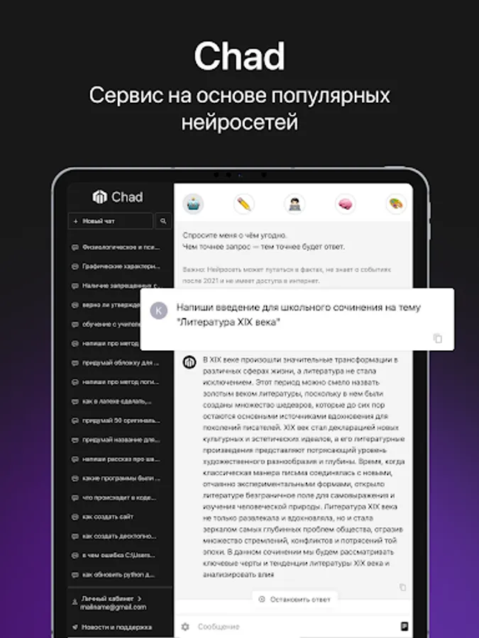 Искусственный интеллект от CHAD поможет в решении ваших рабочих и личных задач! Yapay zeka size farklı bir bilgi seviyesi sunuyor.