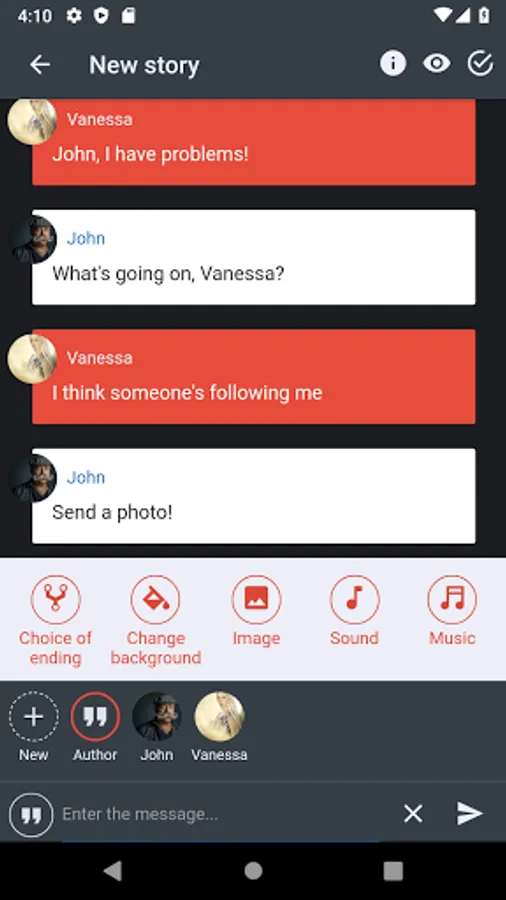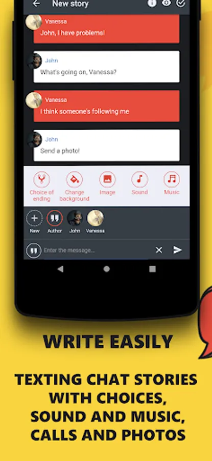 Maybe you want to realize your dreams of writing and find loyal fans of your talent? Mistory is best storytelling platform for you. Thanks to our chat story maker, writing offline fanfics will bring you real pleasure. Diversify your text story with sounds and music, images, calls from participants in the chat story, or let the reader choice the end of the episode. Create a hooked novels in which the reader himself will be the main character! Write your own love stories, horror, creepypasta, or fanfiction, and share them with your friends and our community. The best short stories will end up in the Catalog, where they will be seen by thousands of readers. Isn't this the dream of any author? Publish exciting episodes of your book and get vivid confirmation of your talent in the form of views, likes, reviews and new followers.
