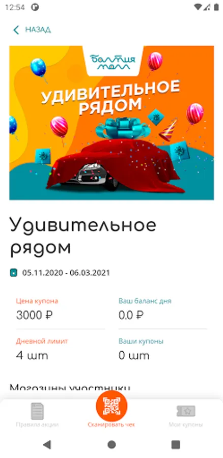 The application provides an opportunity for all visitors of the Baltiya Mall to independently scan receipts for purchases and receive coupons for participating in the promotion.