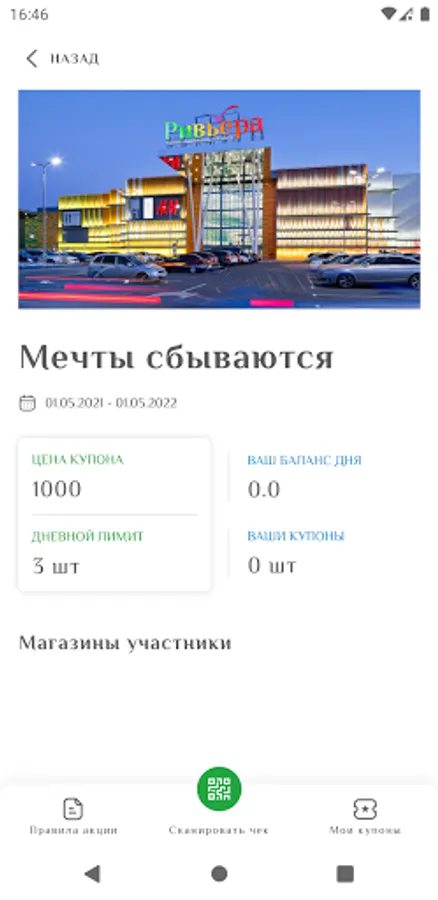 The application provides an opportunity for all visitors of the Riviera shopping and entertainment center to independently scan receipts for purchases and receive coupons for participation in the promotion.