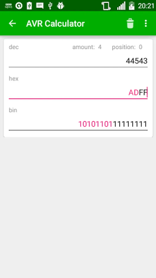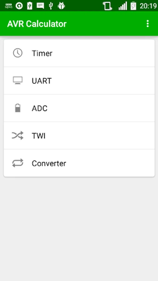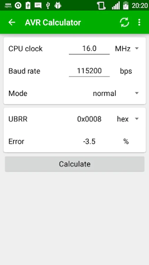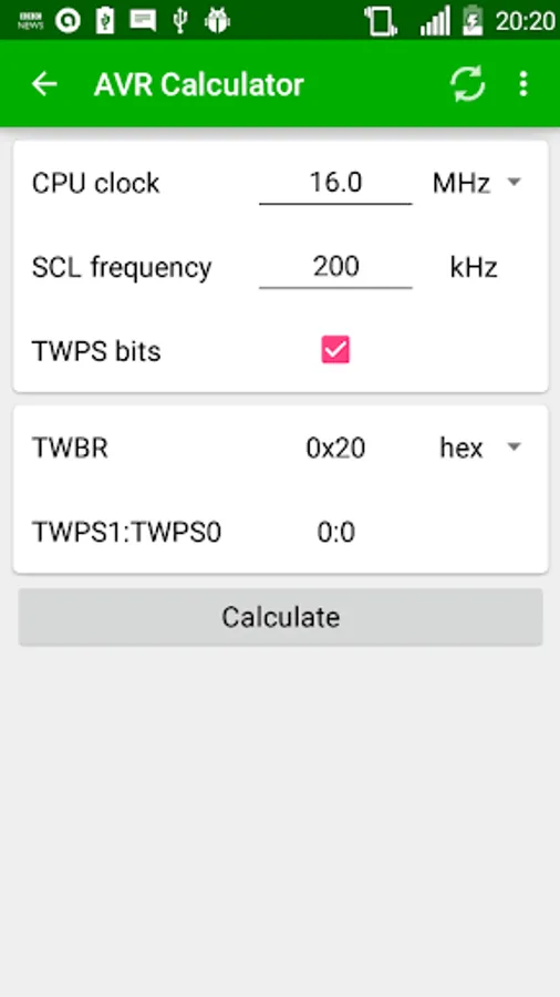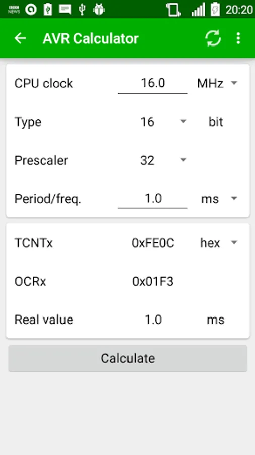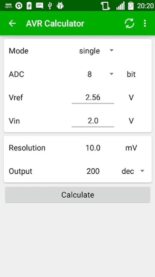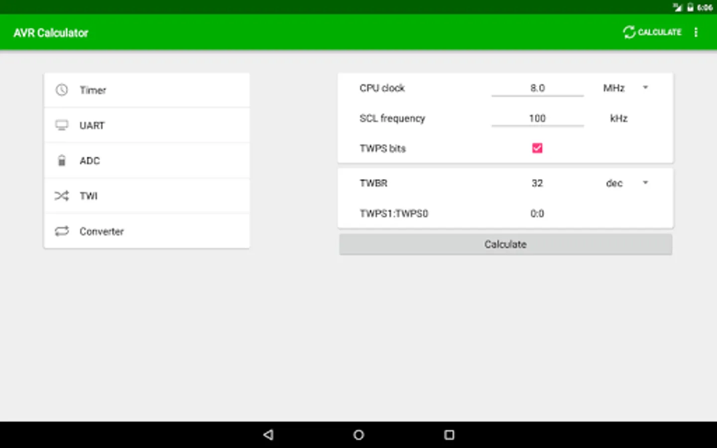 This app is created to help AVR developers. It allows to calculate some register values for hardware modules of AVR microcontrollers, convert analog voltages to ADC values, convert hexadecimal, binary and decimal numbers. The app contains following calculators: