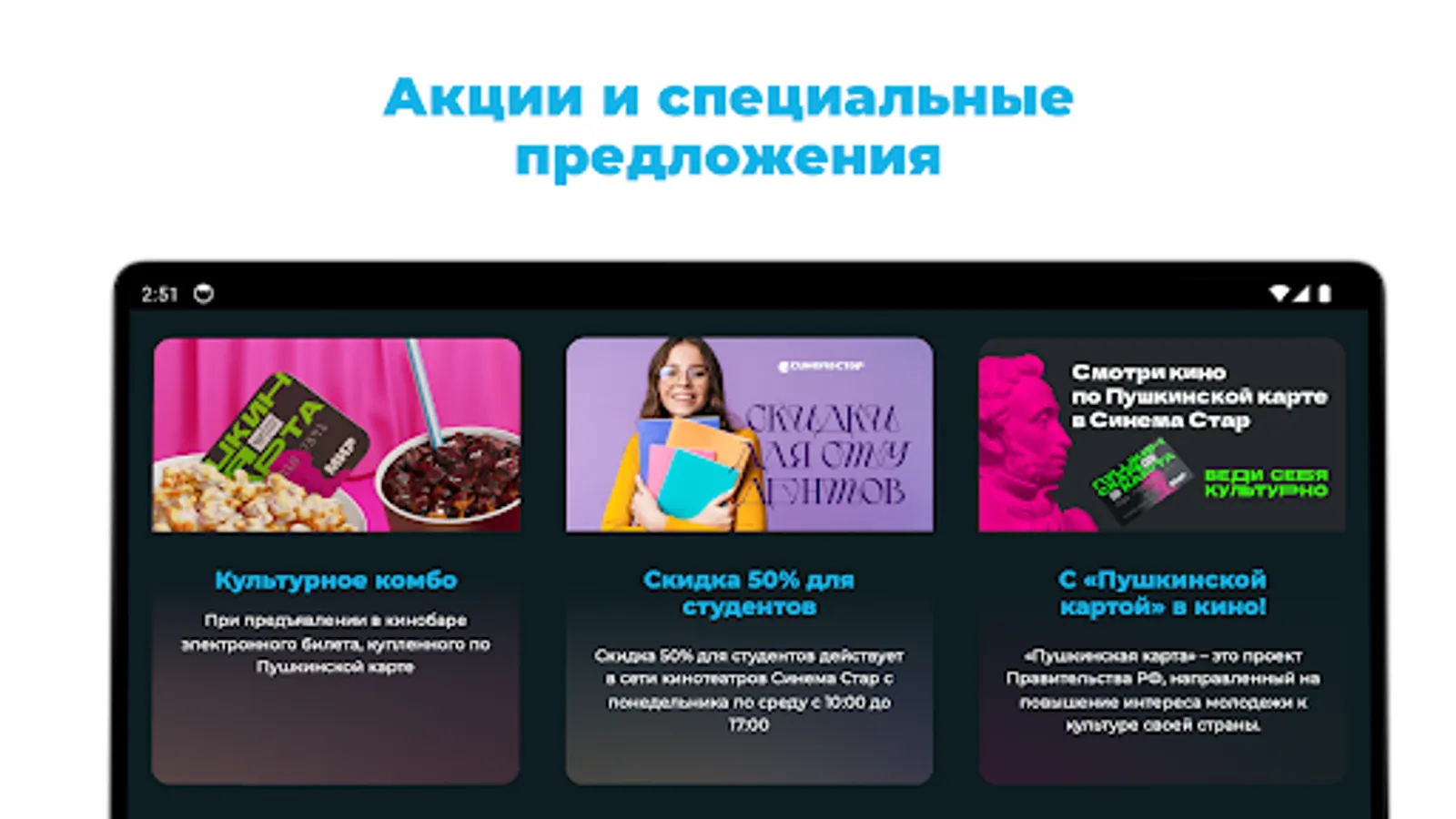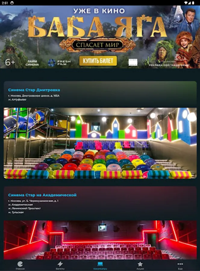 With the application released by the Cinema Star network, you can buy tickets at any time, anywhere in the city. In a cafe, on a walk, in transport and even in the most unexpected places - without restrictions. And what is even more pleasant - without extra charges, commissions and any other markups.
