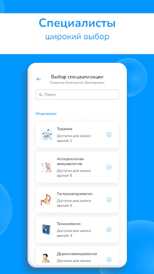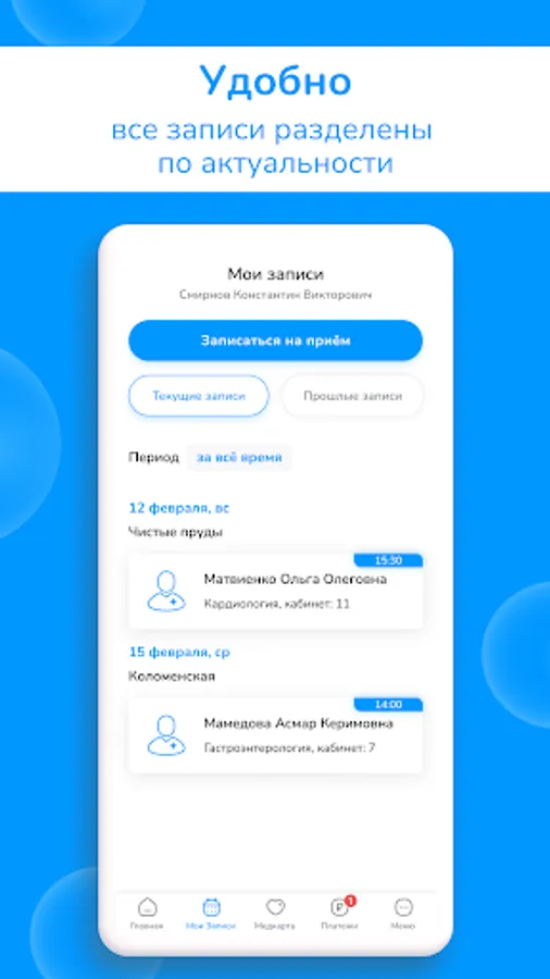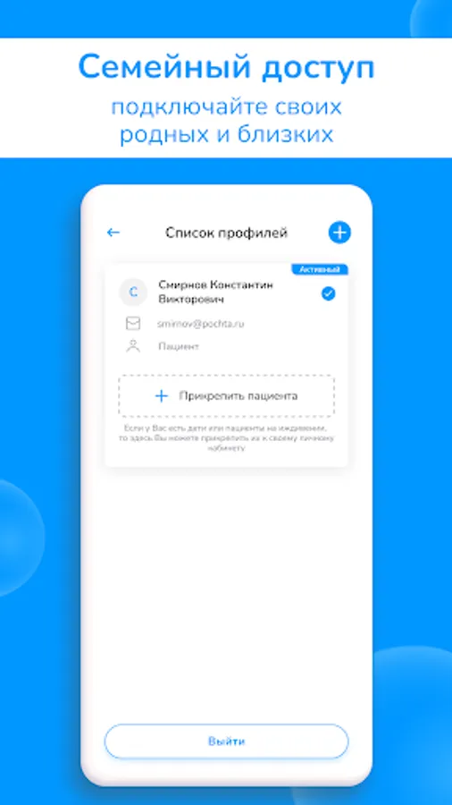 - Make an appointment with a doctor, receive medical data after an appointment and a reminder of an upcoming visit.