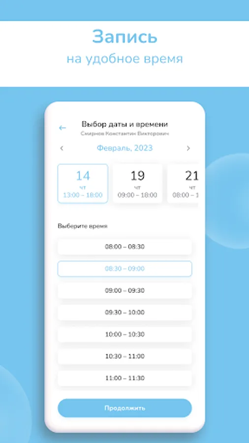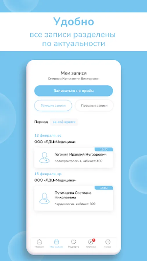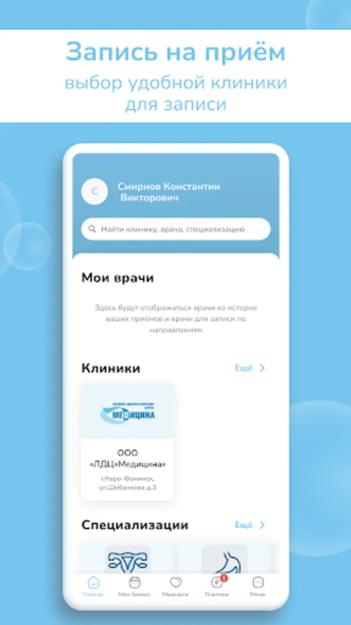 - independently and quickly make an appointment for a consultation or examination with the choice of a specialist, date and convenient time without calling the clinic;