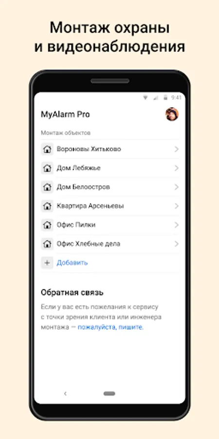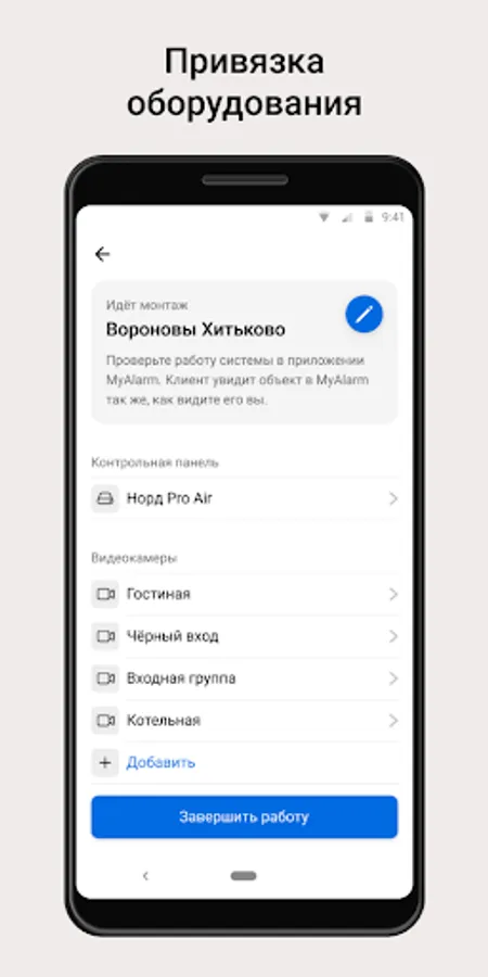 Application for installing the MyAlarm security system with video surveillance and smart home elements.