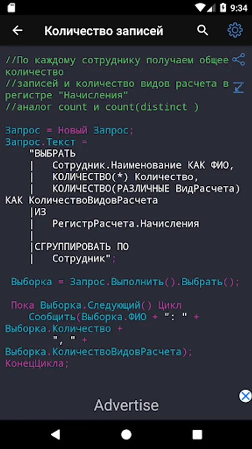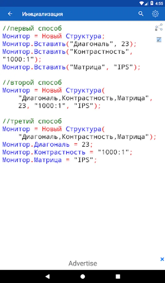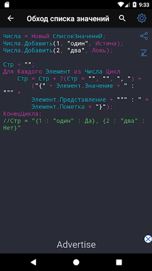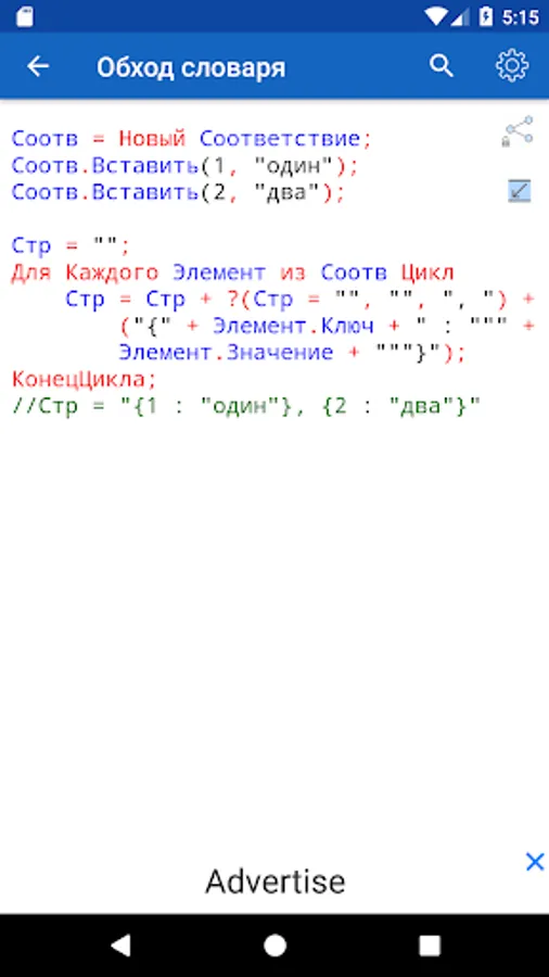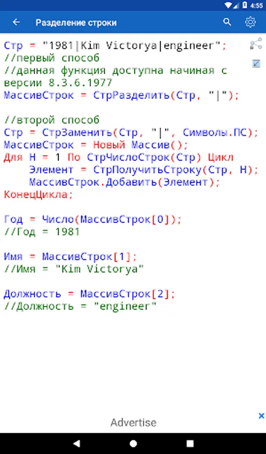 ✓ Learning the syntax of the language on specific code examples. How to get a substring? How to start a background job? These and over 350 more examples are available in the app.