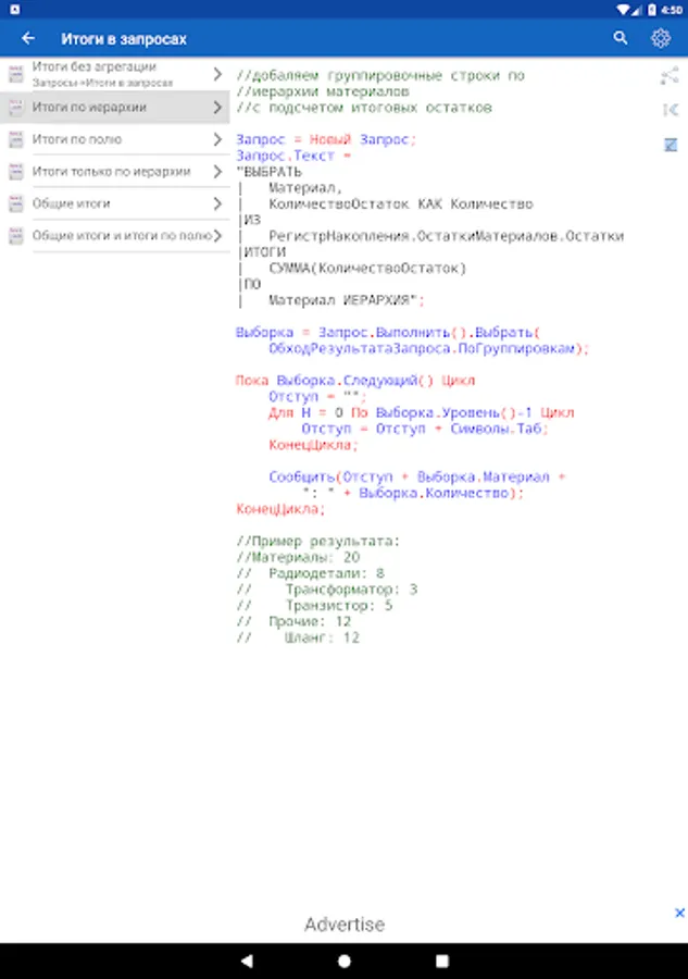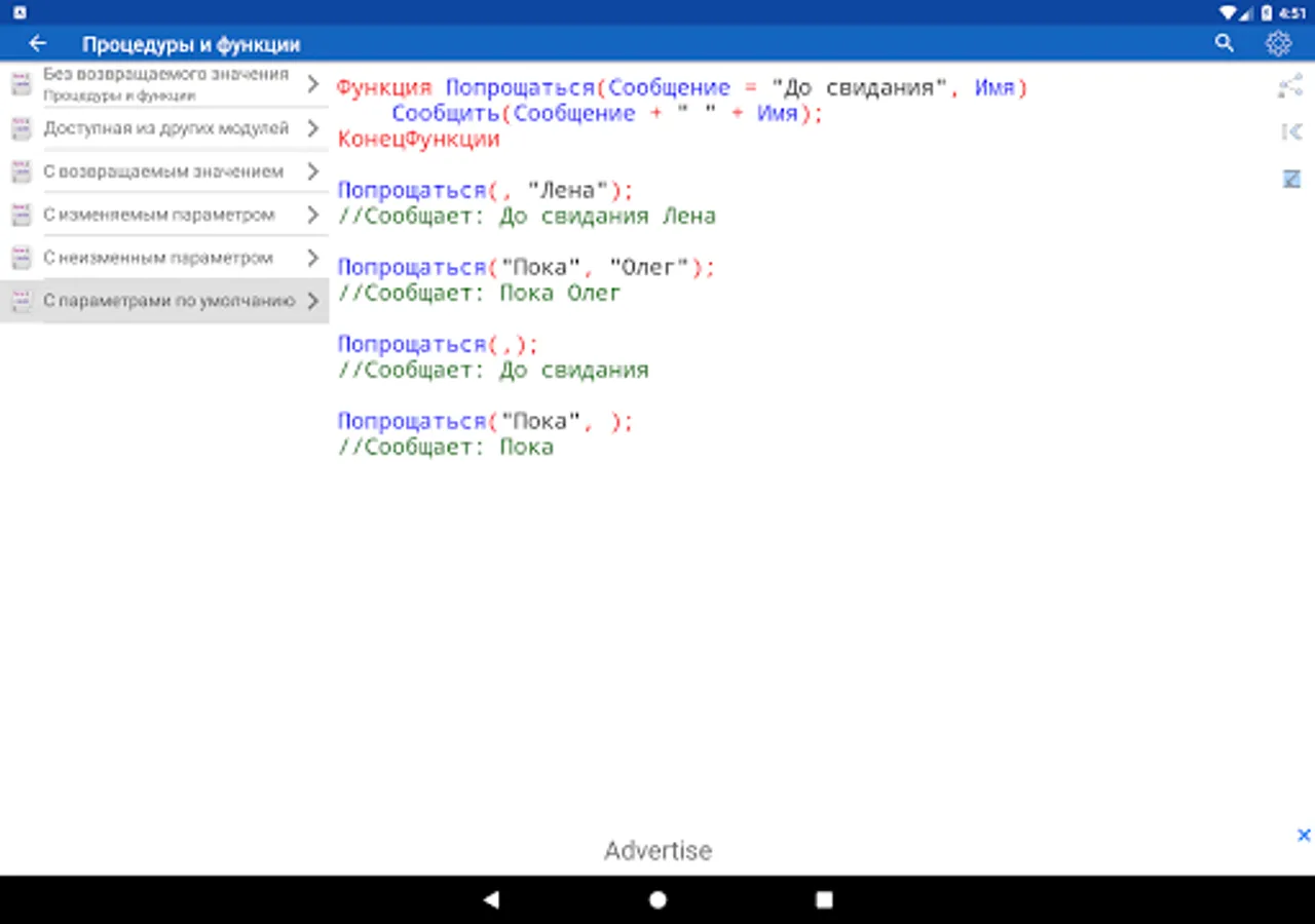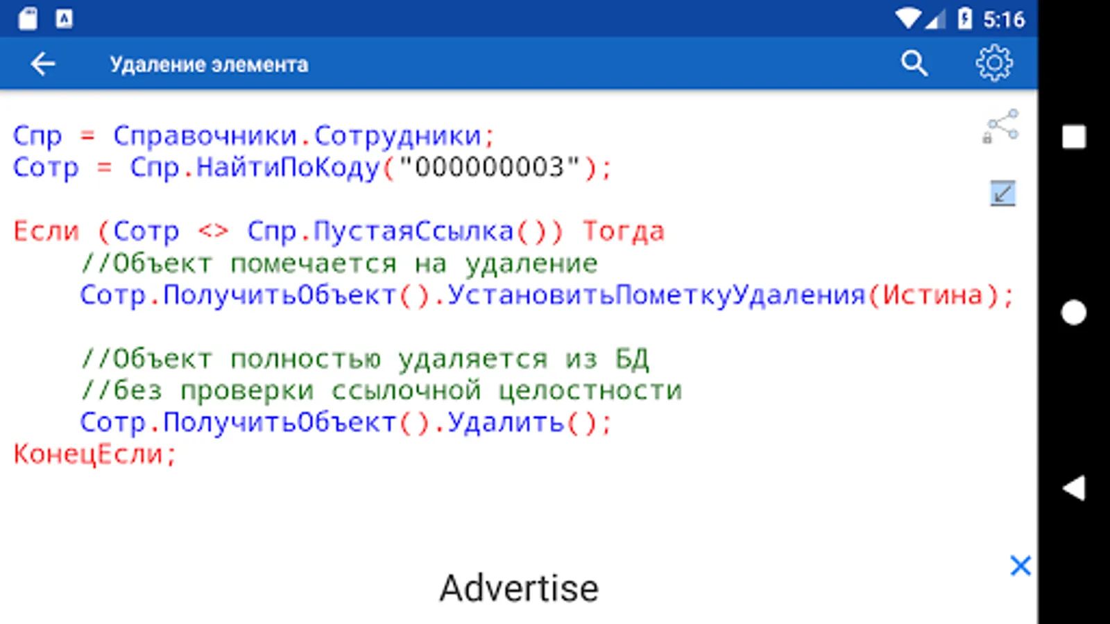 ✓ The application is a good tool when taking an exam or preparing for an interview, because. contains a reference book of typical, frequently used operations in the 1C language.
