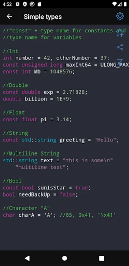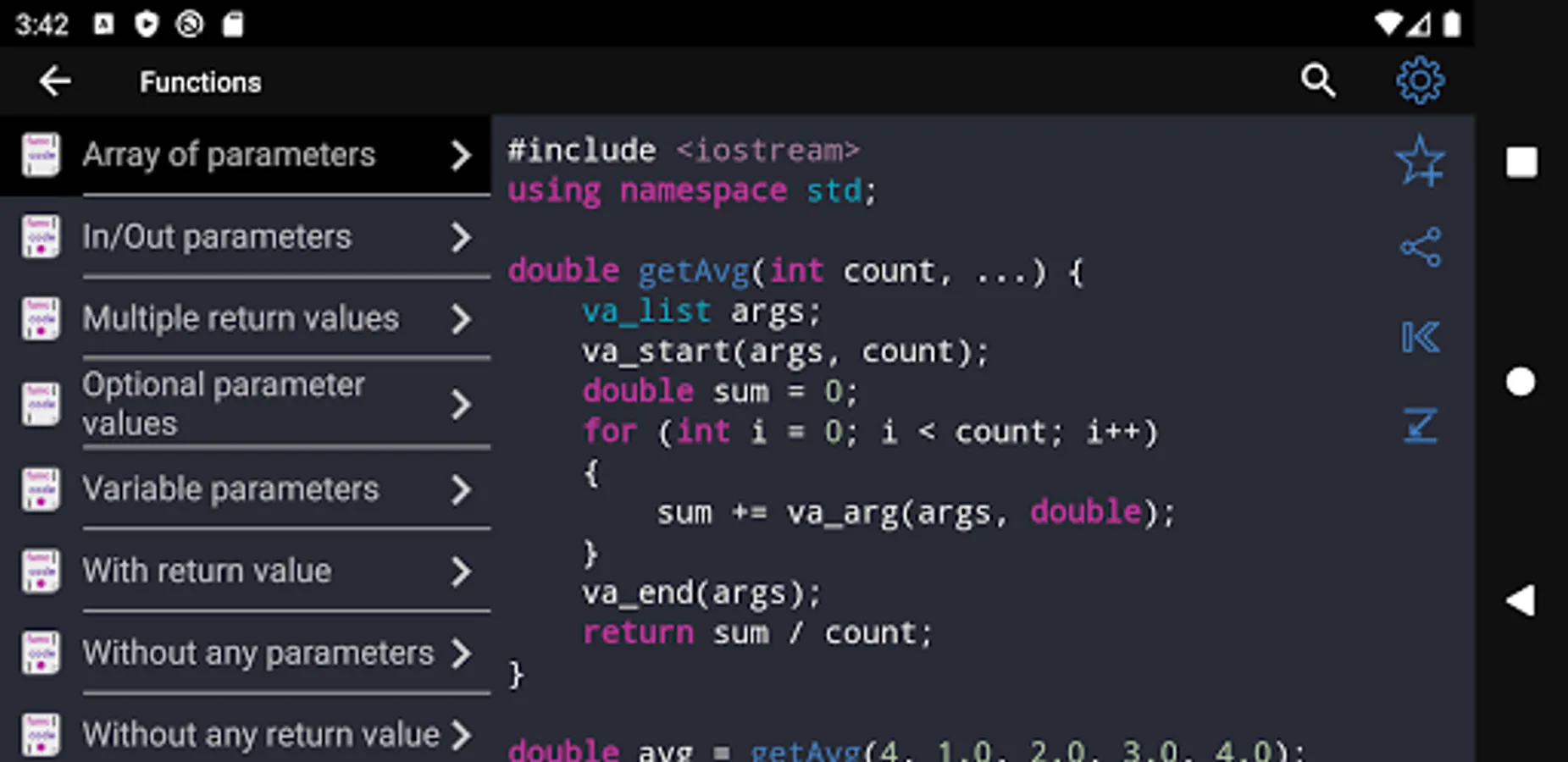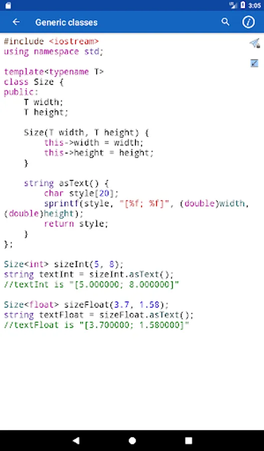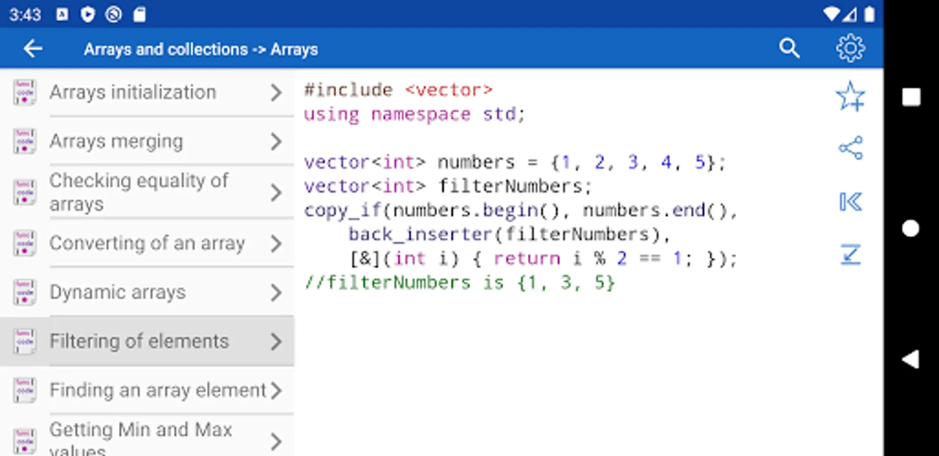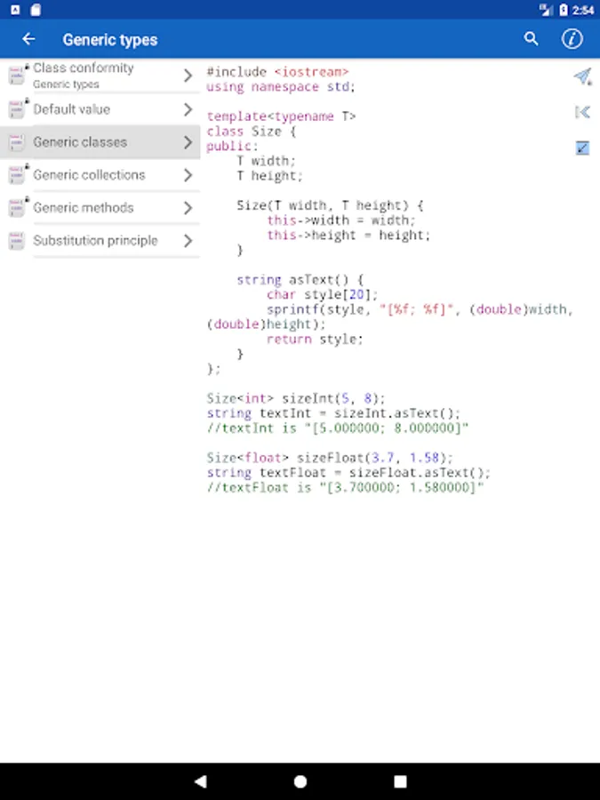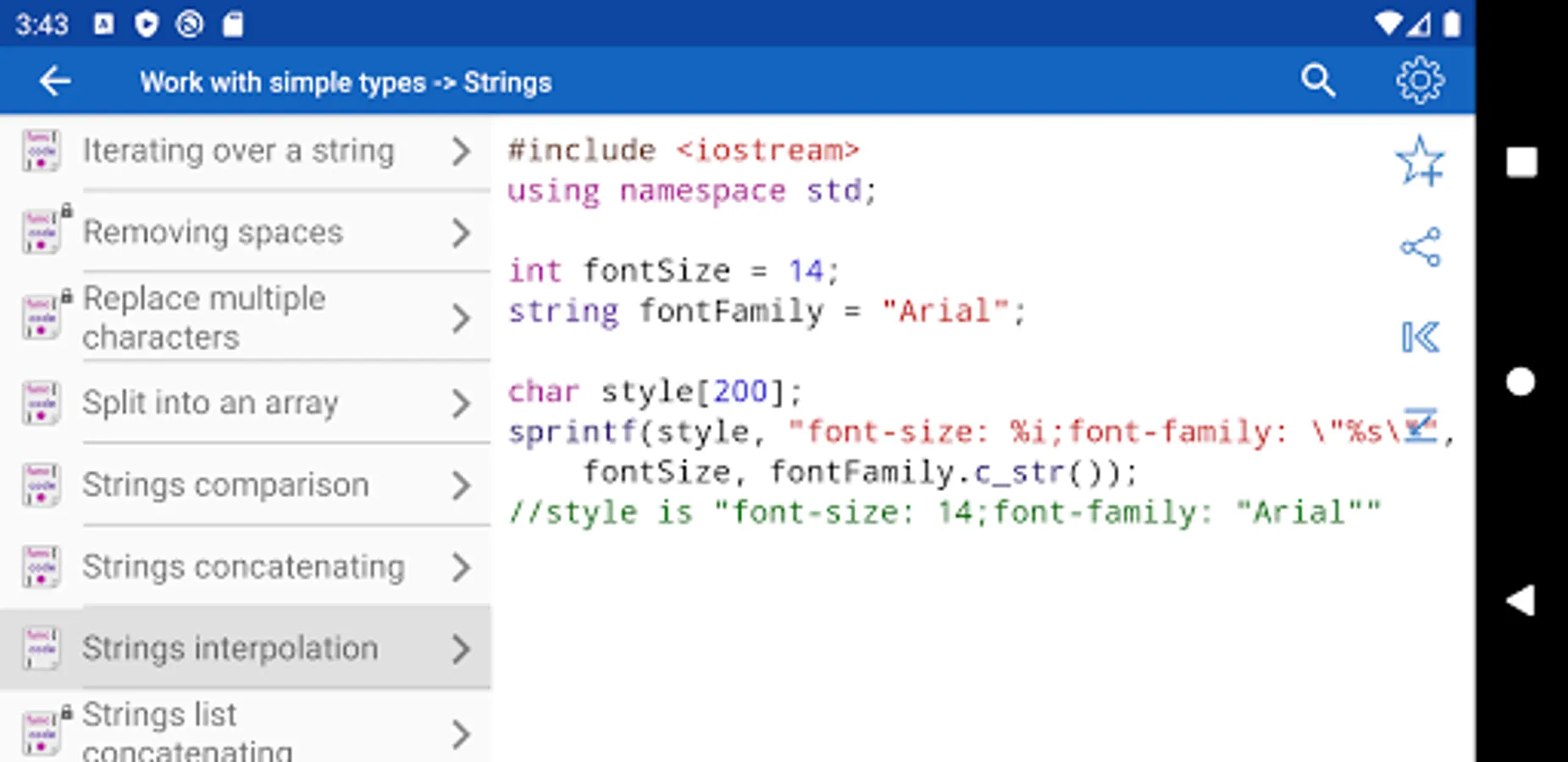 ✓ Learning C++ syntax on specific code examples. How to get a substring? How to declare a generalized method? These and over 300 of other code samples for C++ are available in the application.