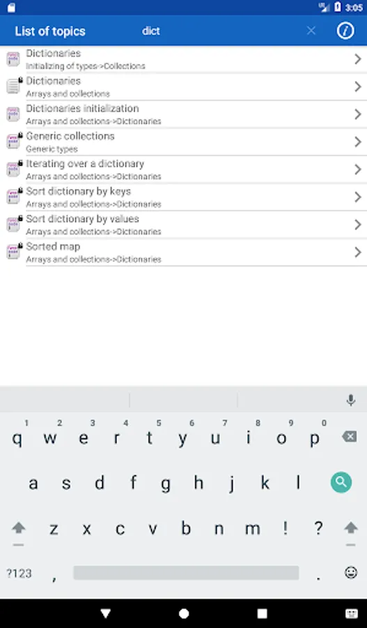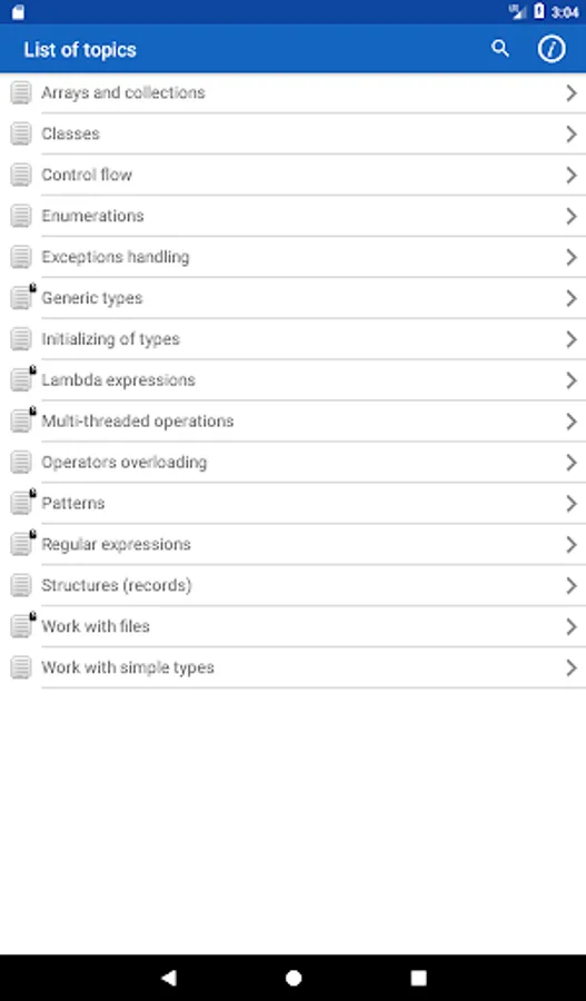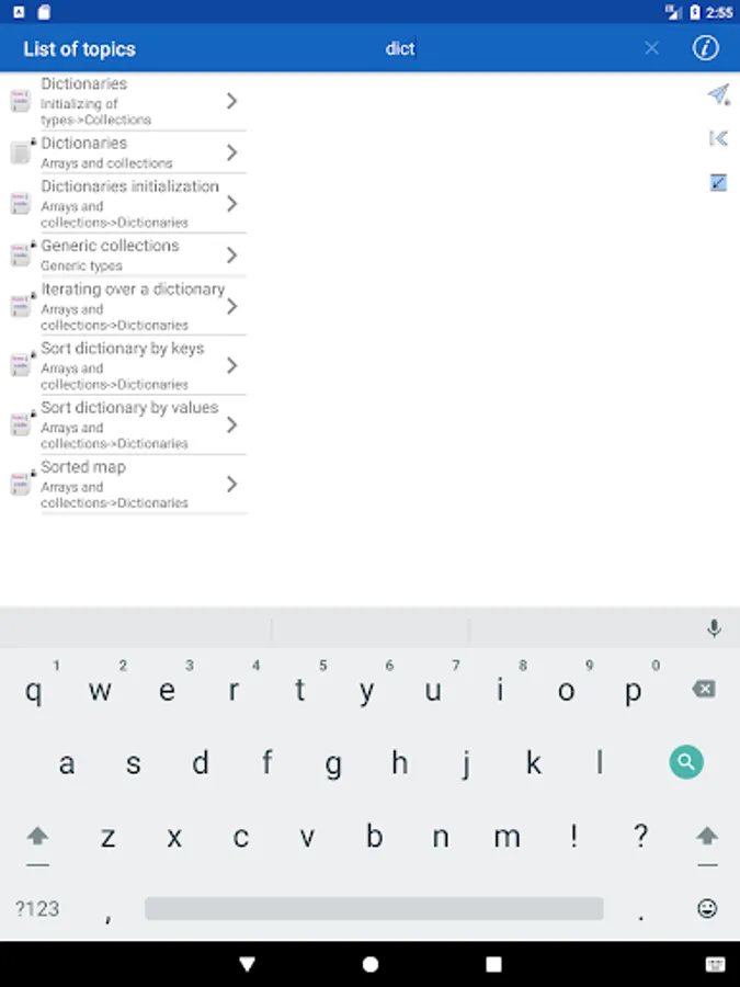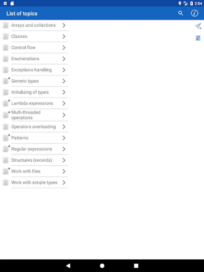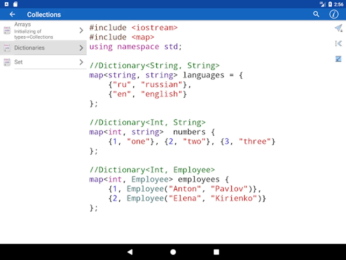✓ The application is a good tool during the exam or the preparation to the interview because it contains a reference to frequently used operations in different programming languages.