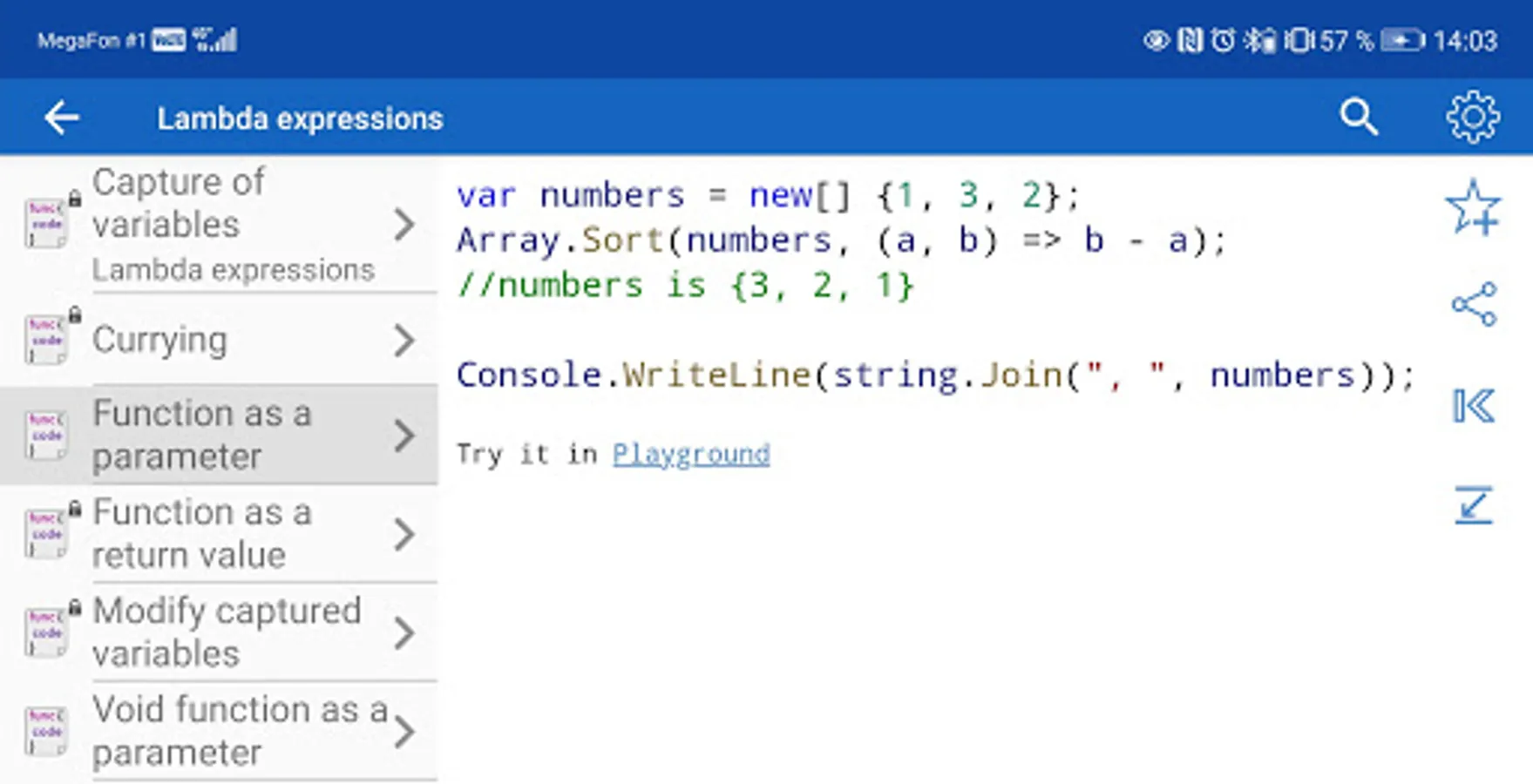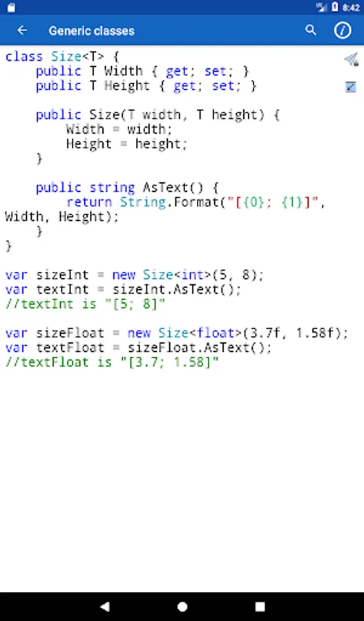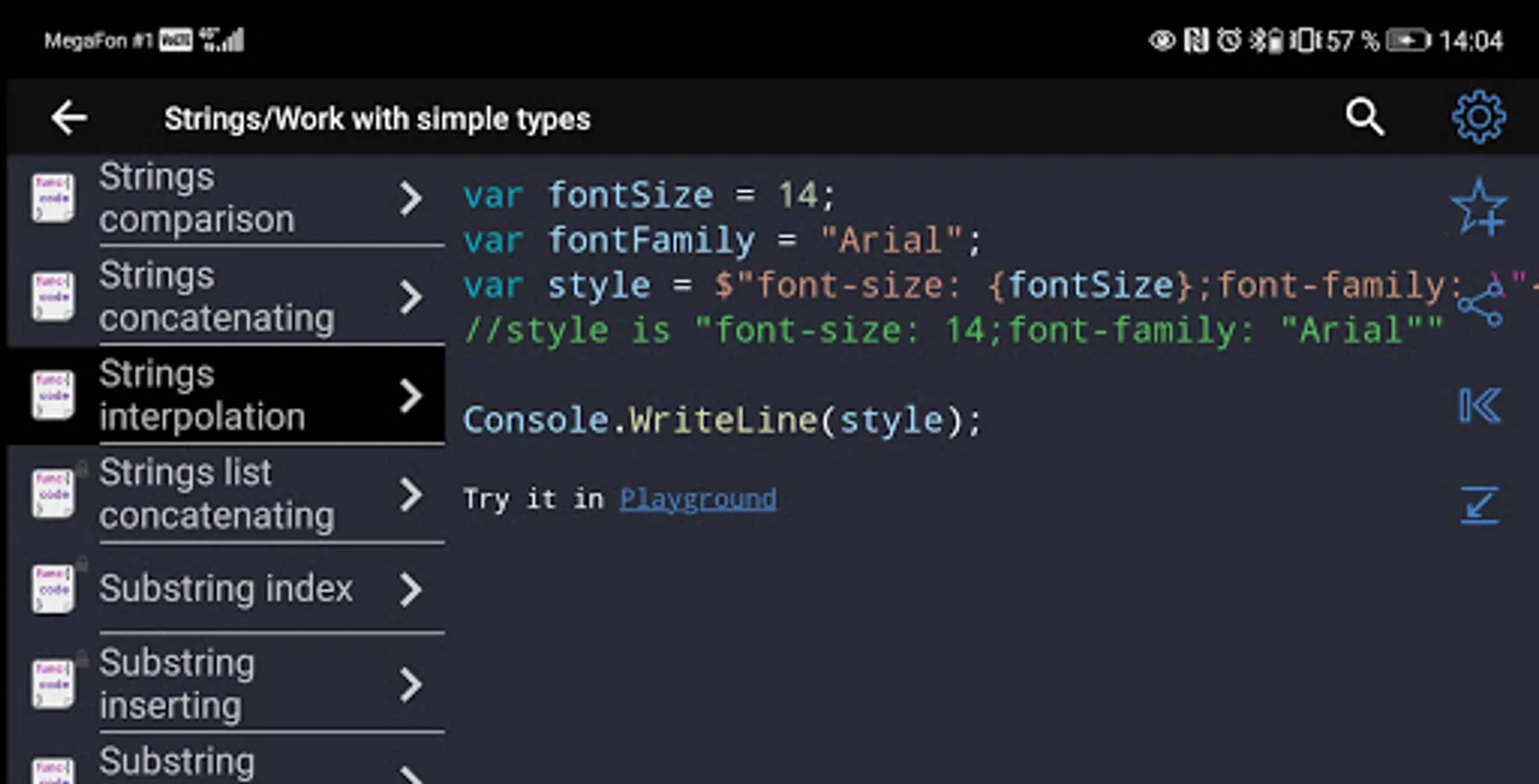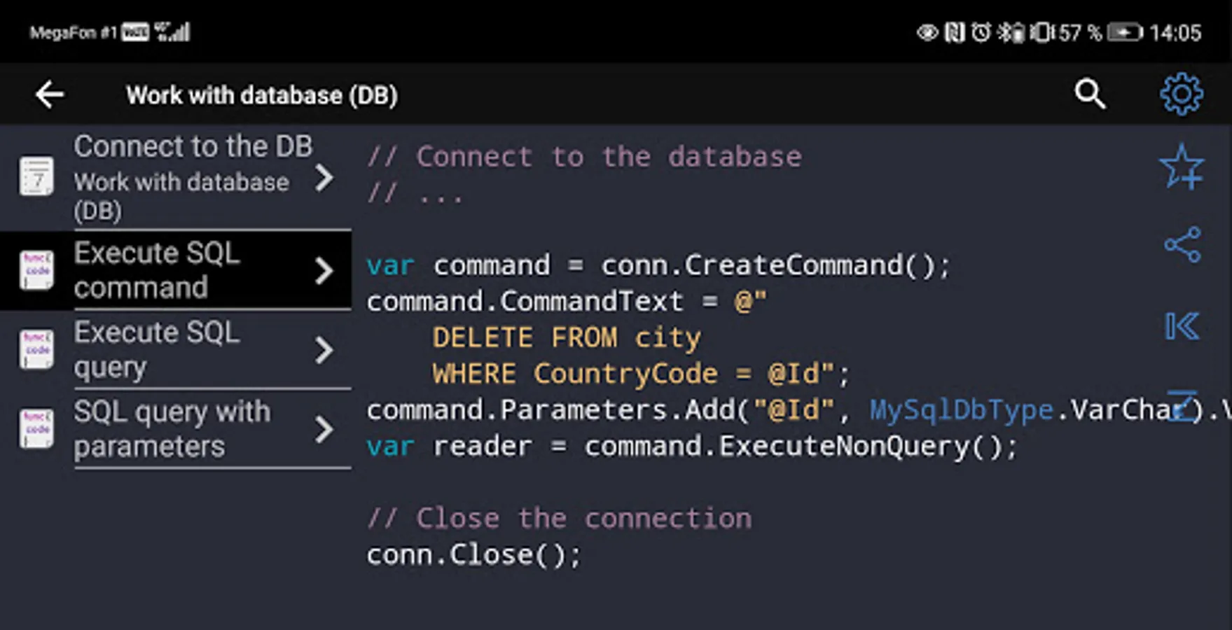 ✓ Learning C# syntax on specific code examples. How to get a substring? How to declare a generalized method? These and over 350 of other code samples for C# are available in the application.