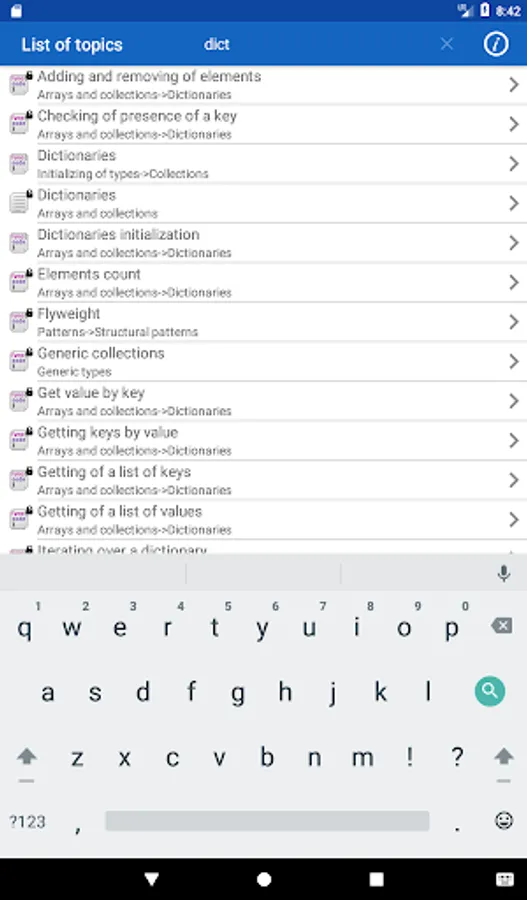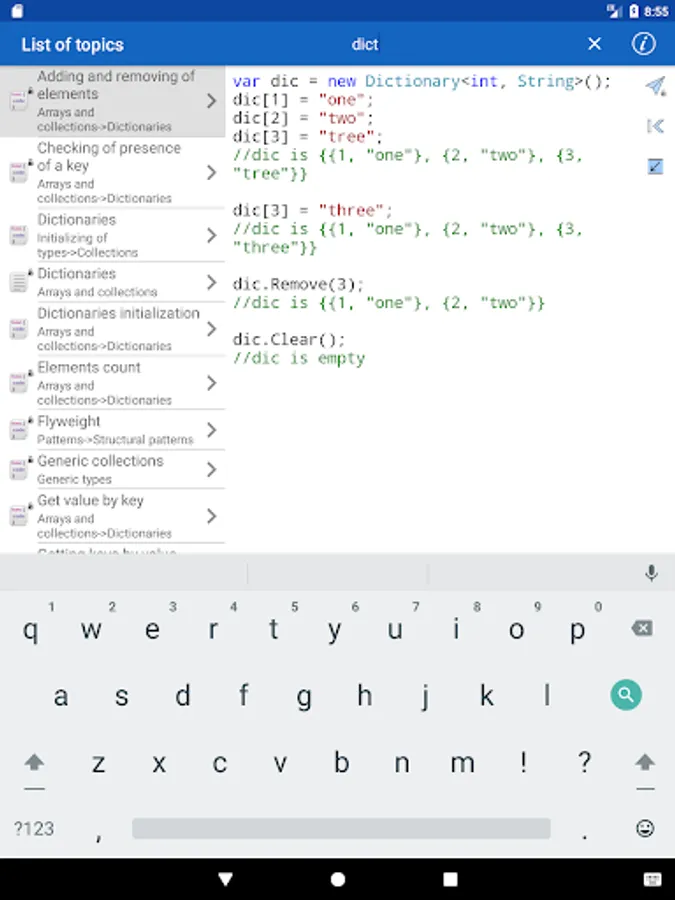 ✓ The application is a good tool during the exam or the preparation to the interview because it contains a reference to frequently used operations in different programming languages.