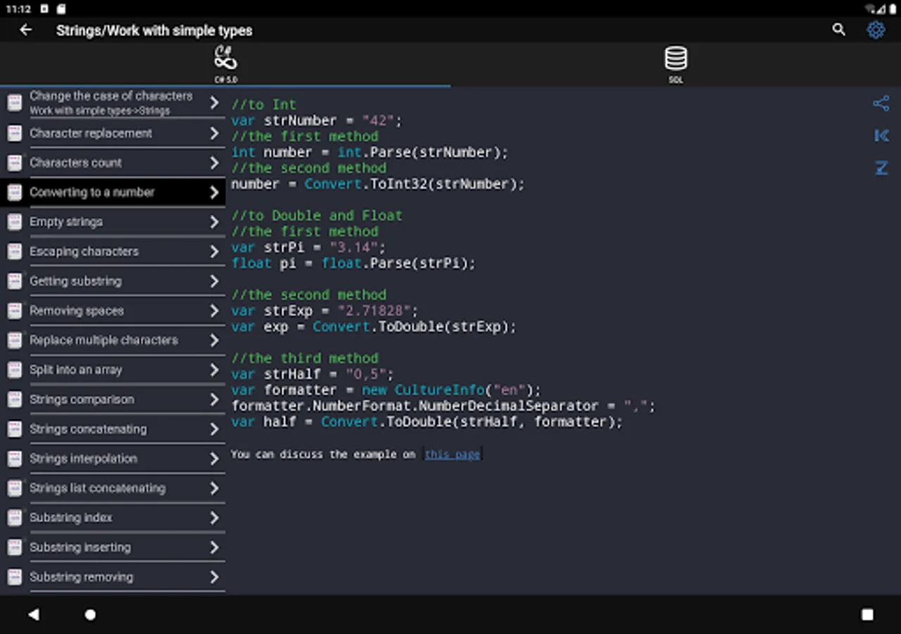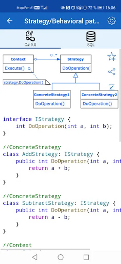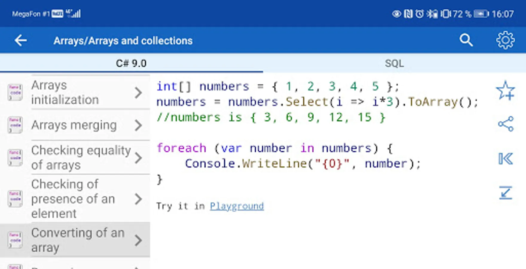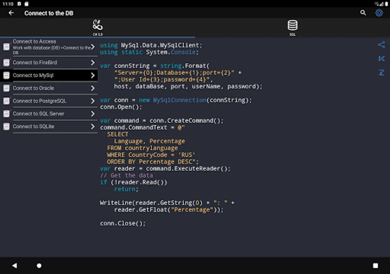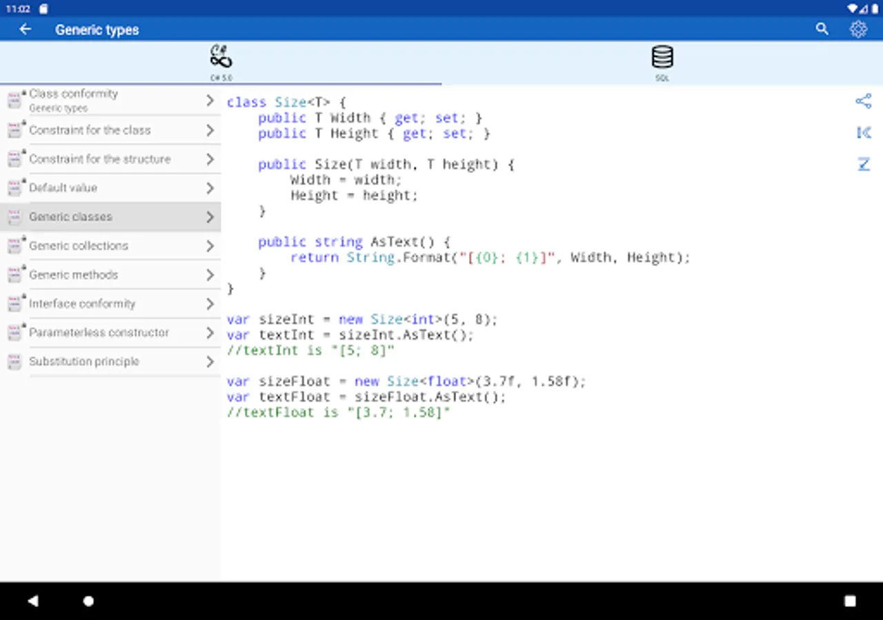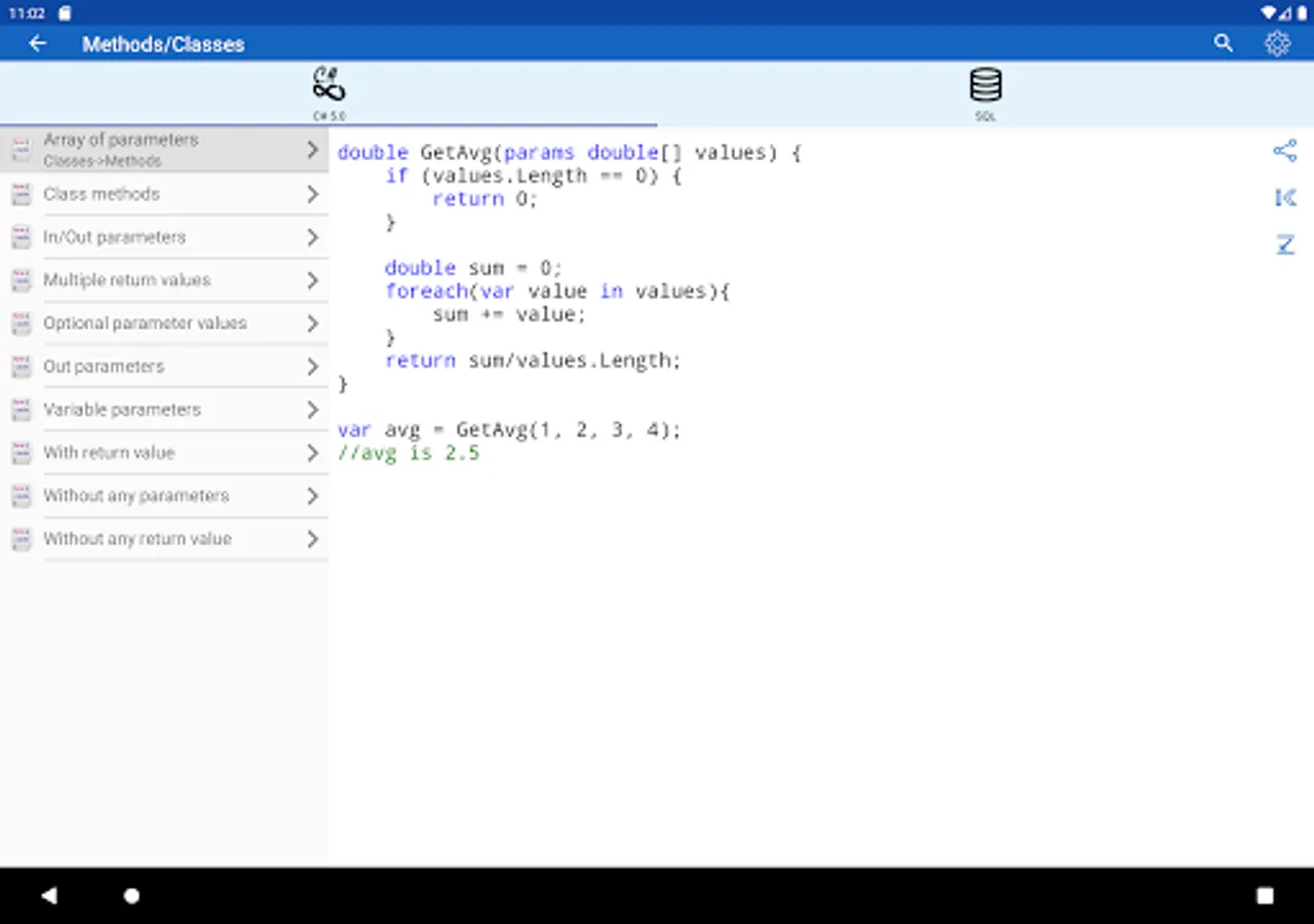 ✓ The application is a good tool during the exam or the preparation to the interview because it contains a reference to frequently used operations in different programming languages.