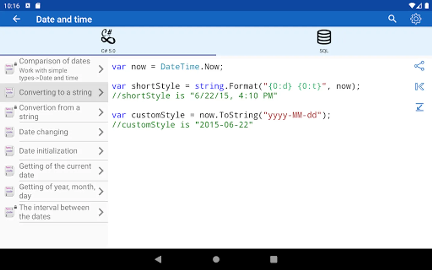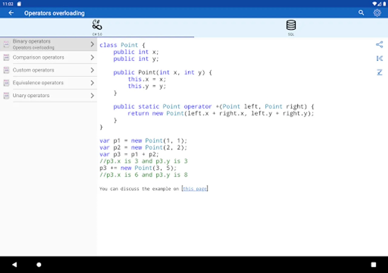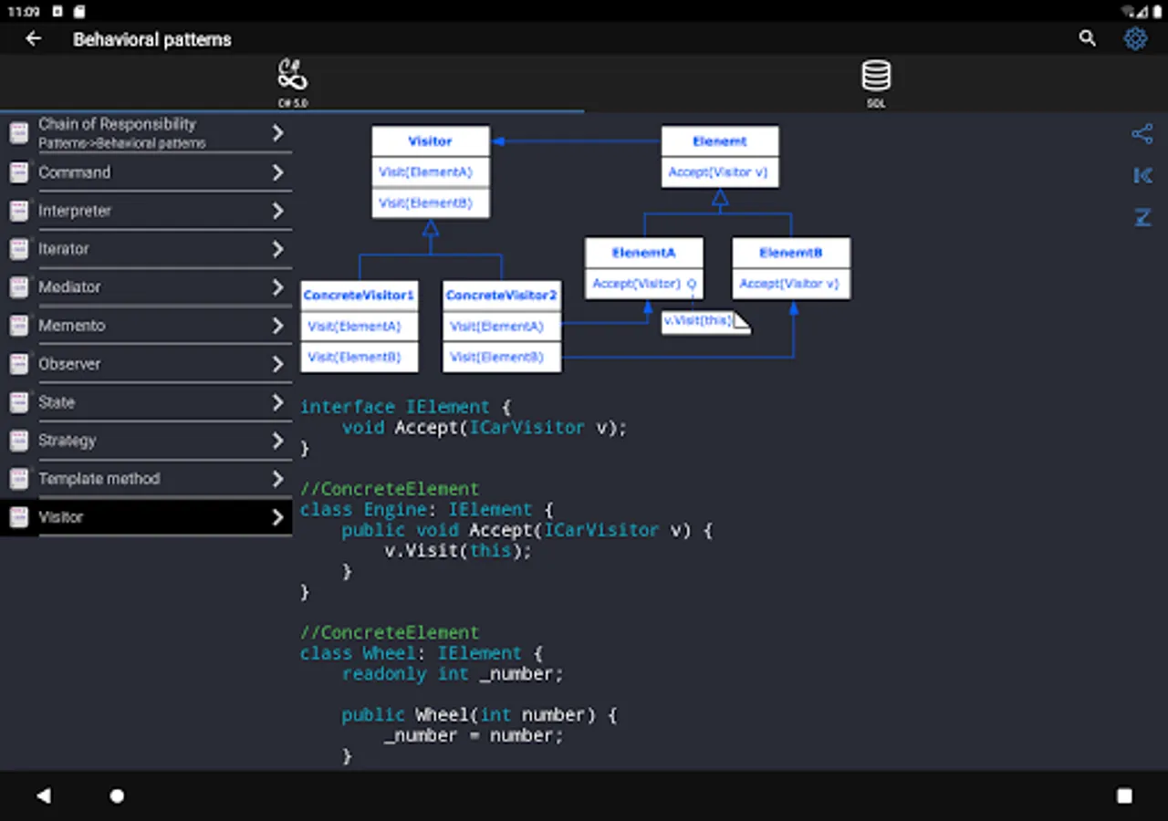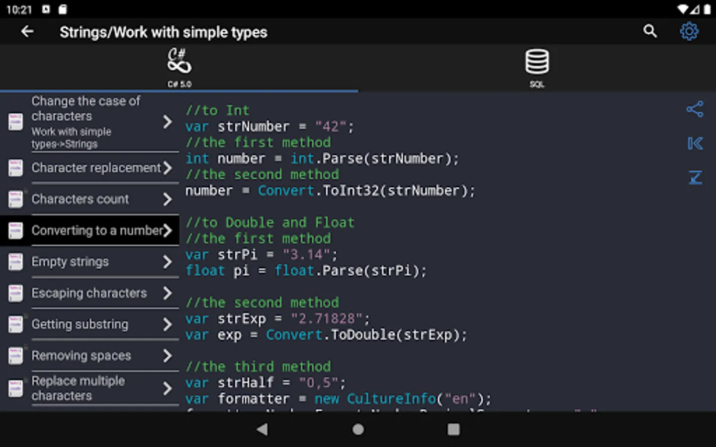✓ The application is a good tool during the exam or the preparation to the interview because it contains a reference to frequently used operations in different programming languages.
