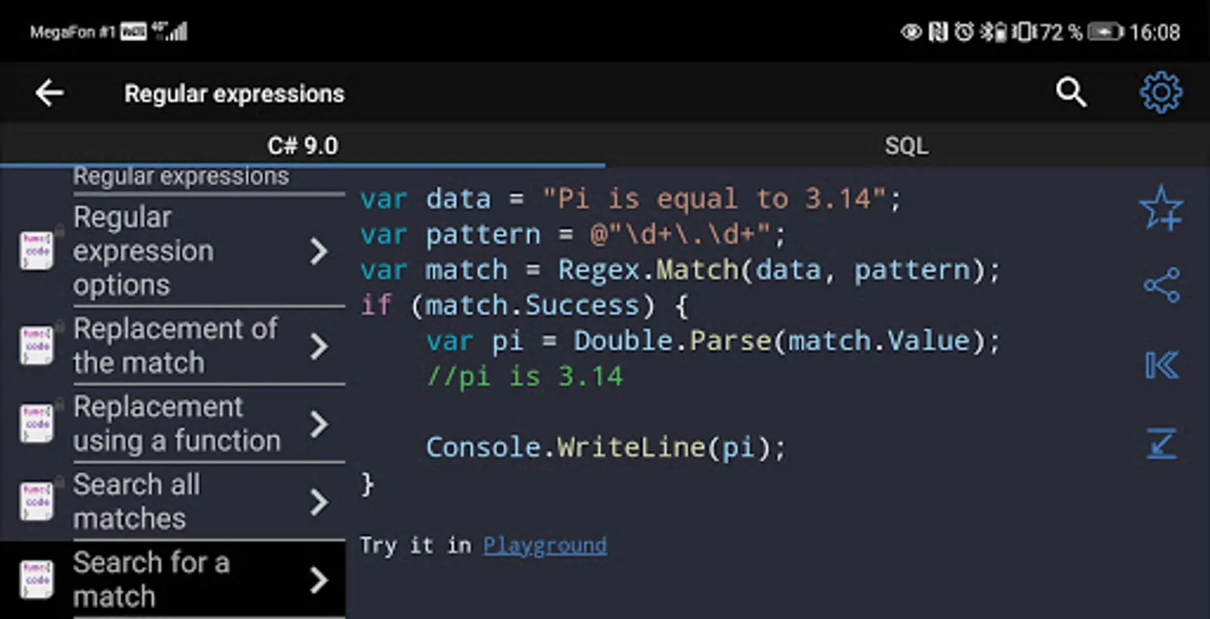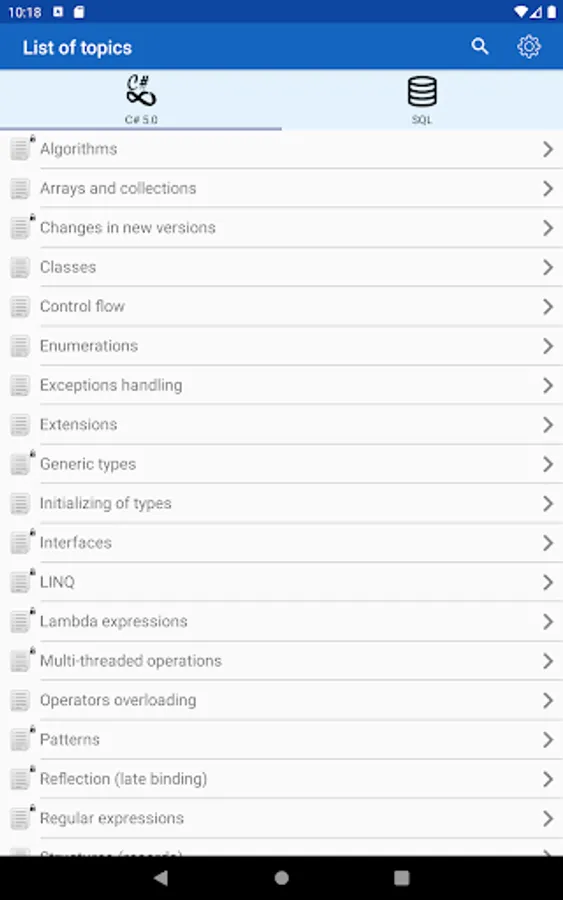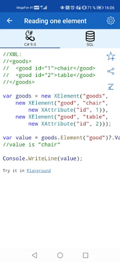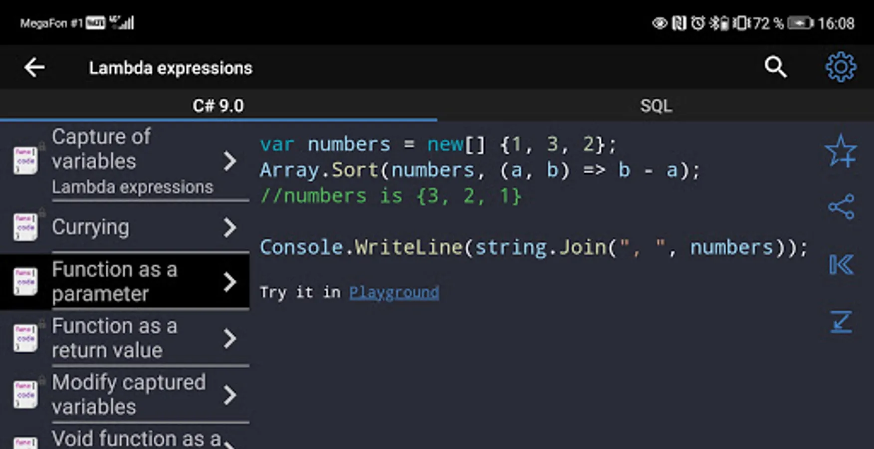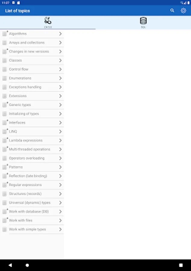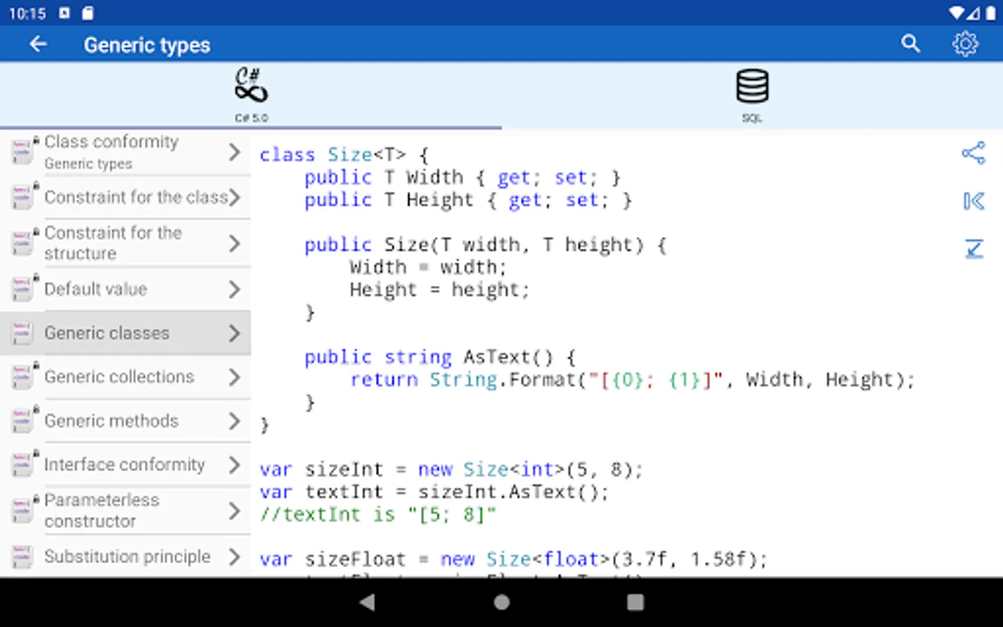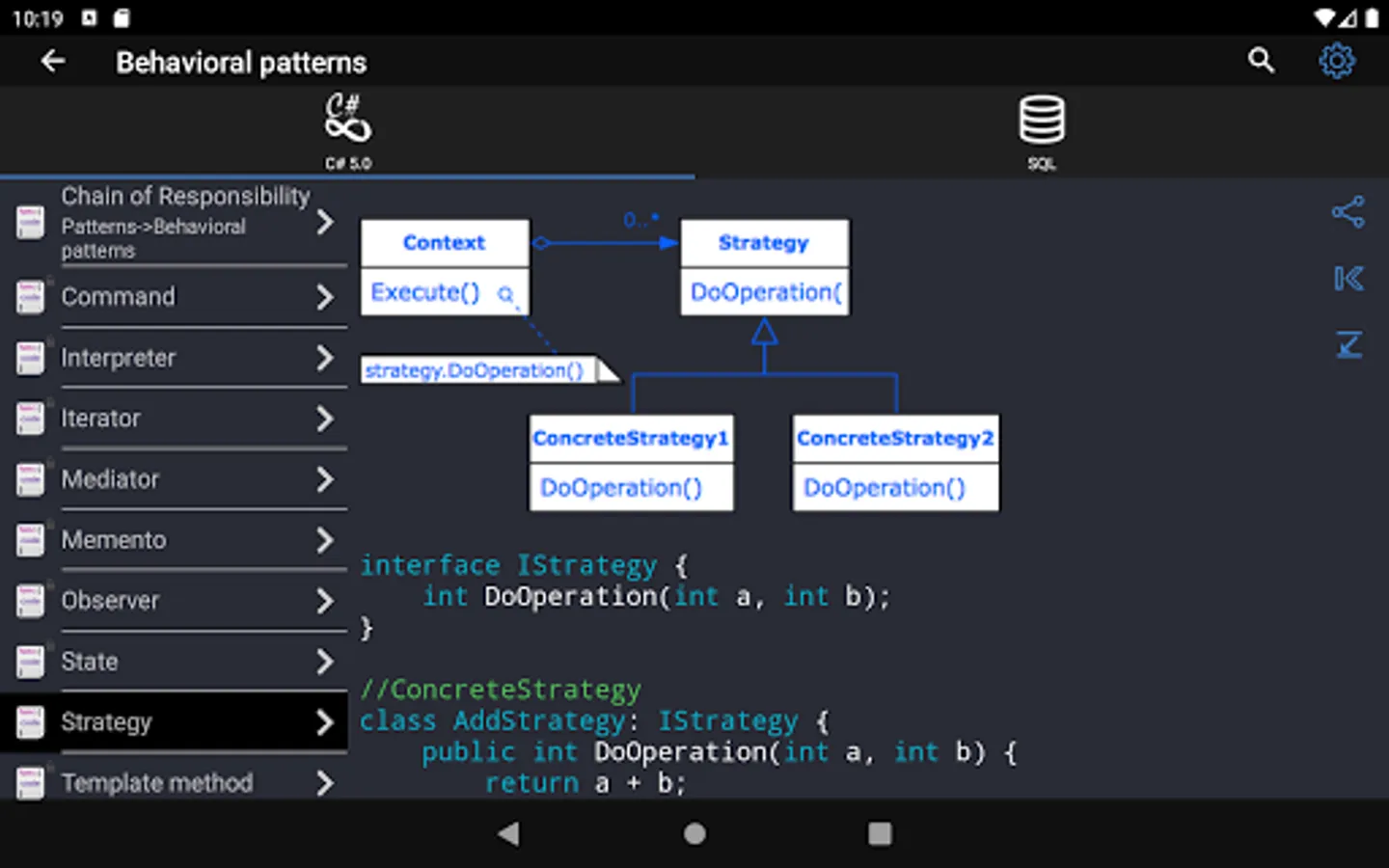✓ The application is a good tool during the exam or the preparation to the interview because it contains a reference to frequently used operations in different programming languages.