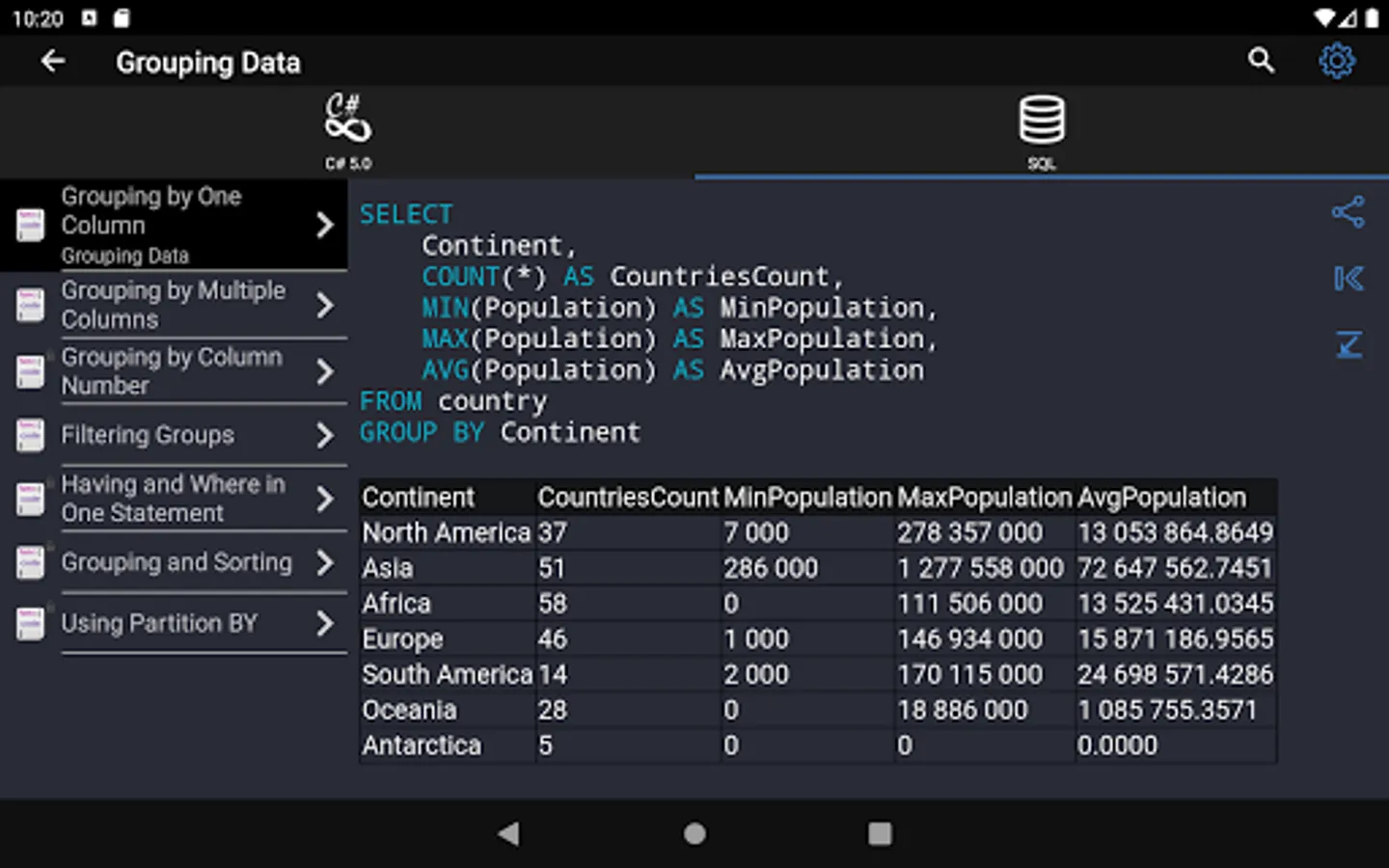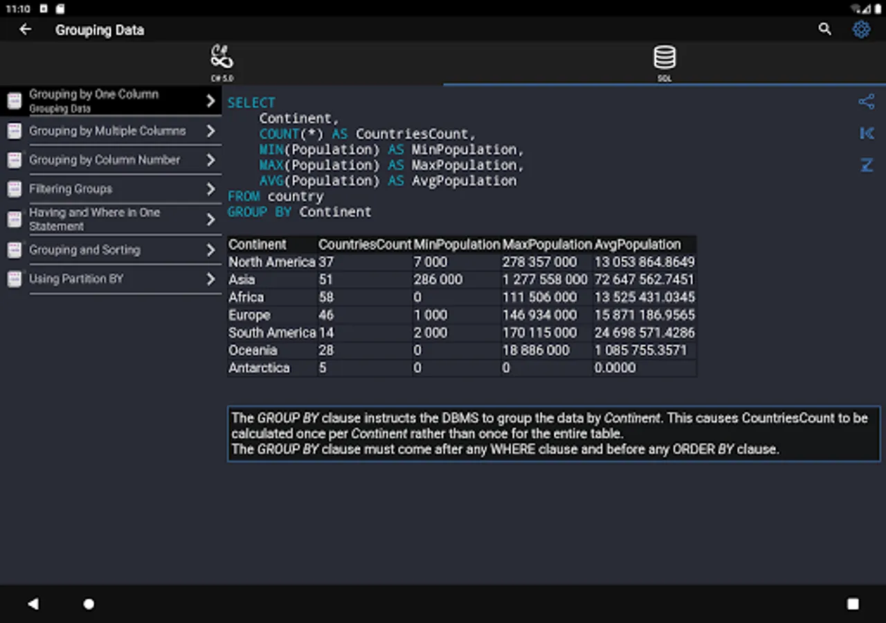 Learning C# 9 and SQL syntax on specific code examples.