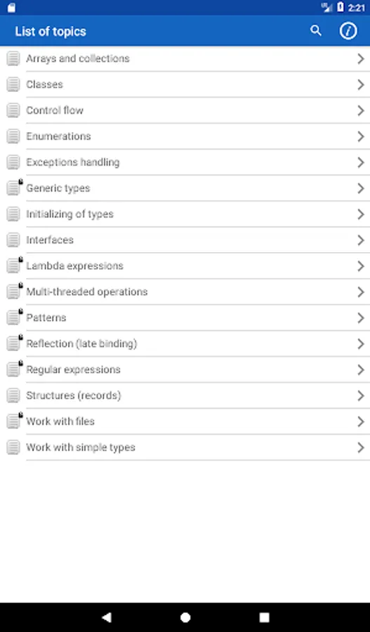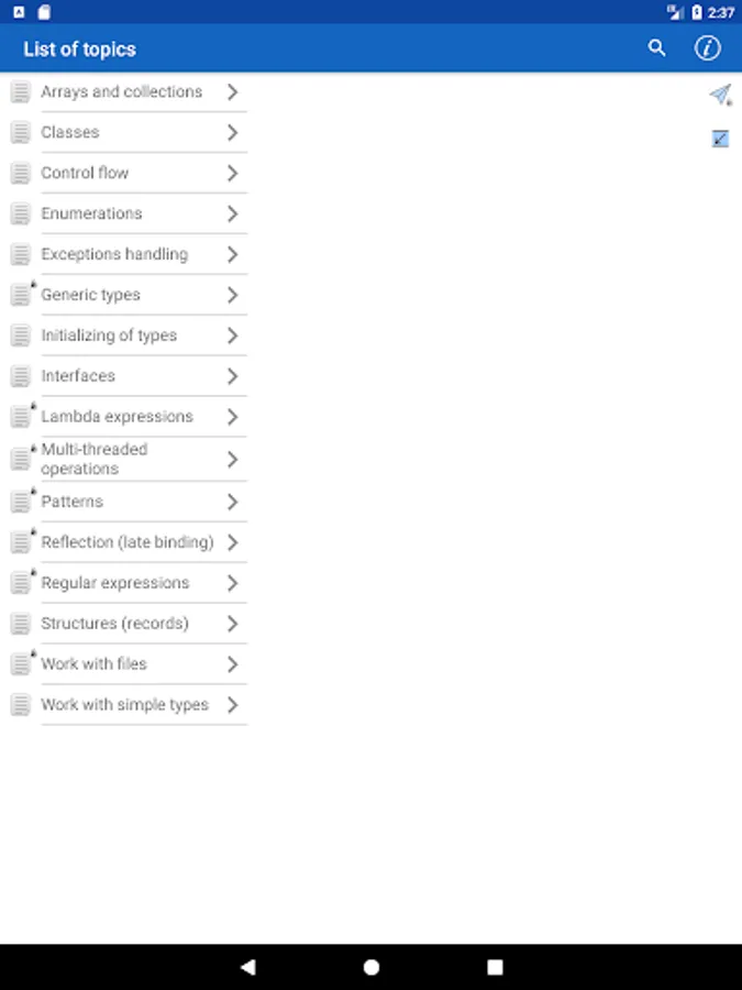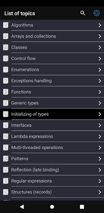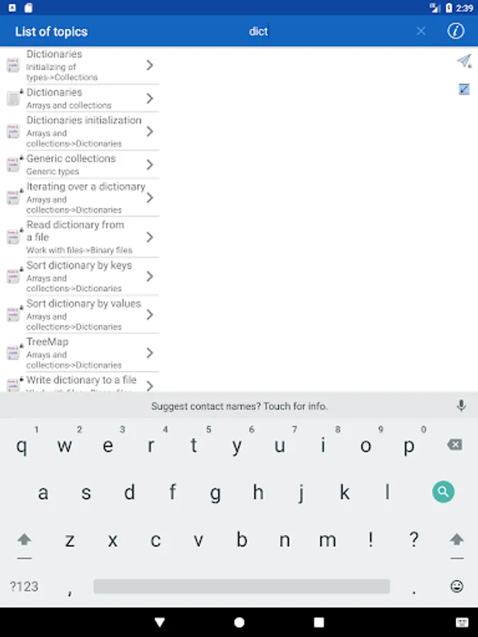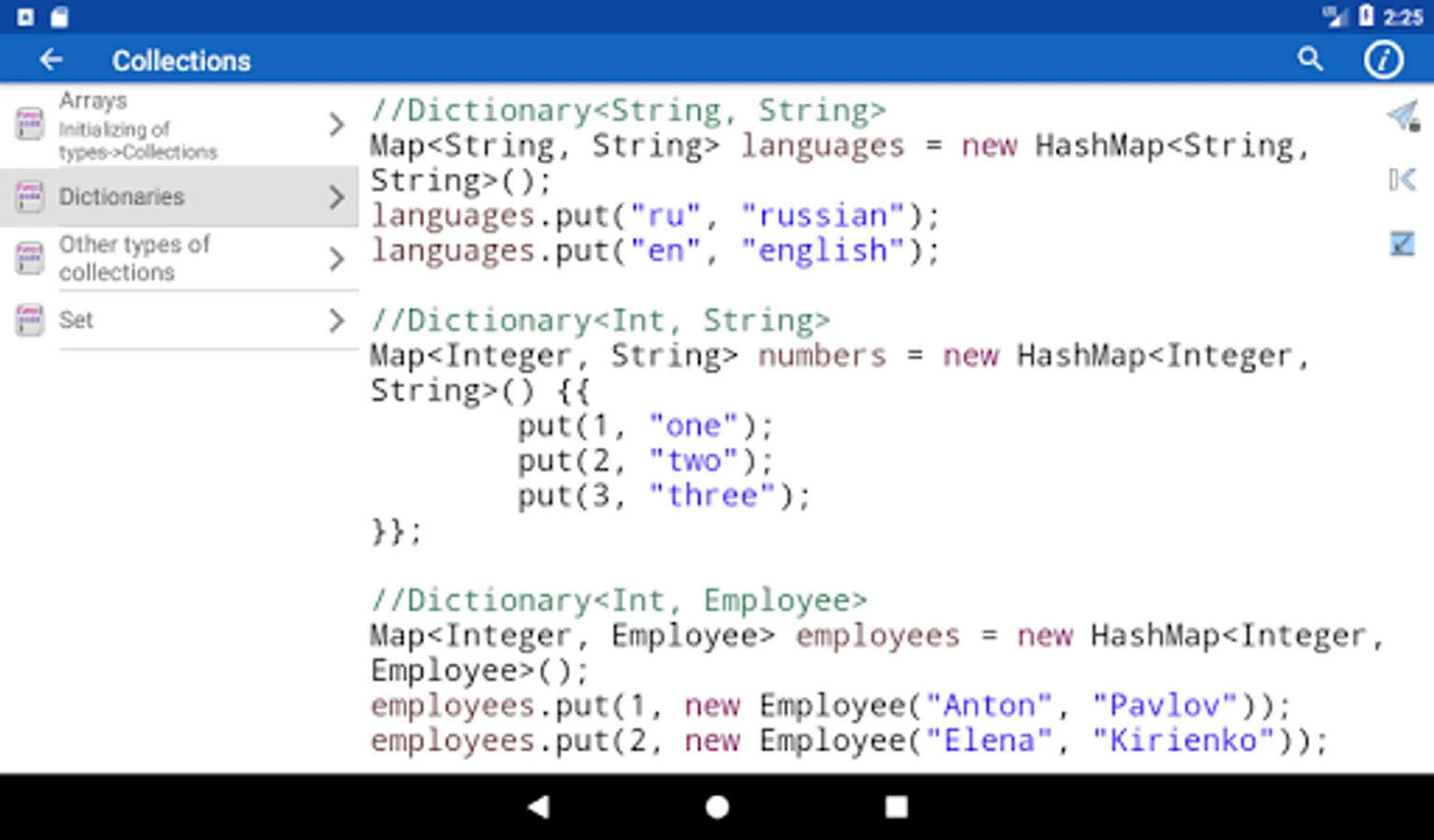 ✓ The application is a good tool during the exam or the preparation to the interview because it contains a reference to frequently used operations in different programming languages.