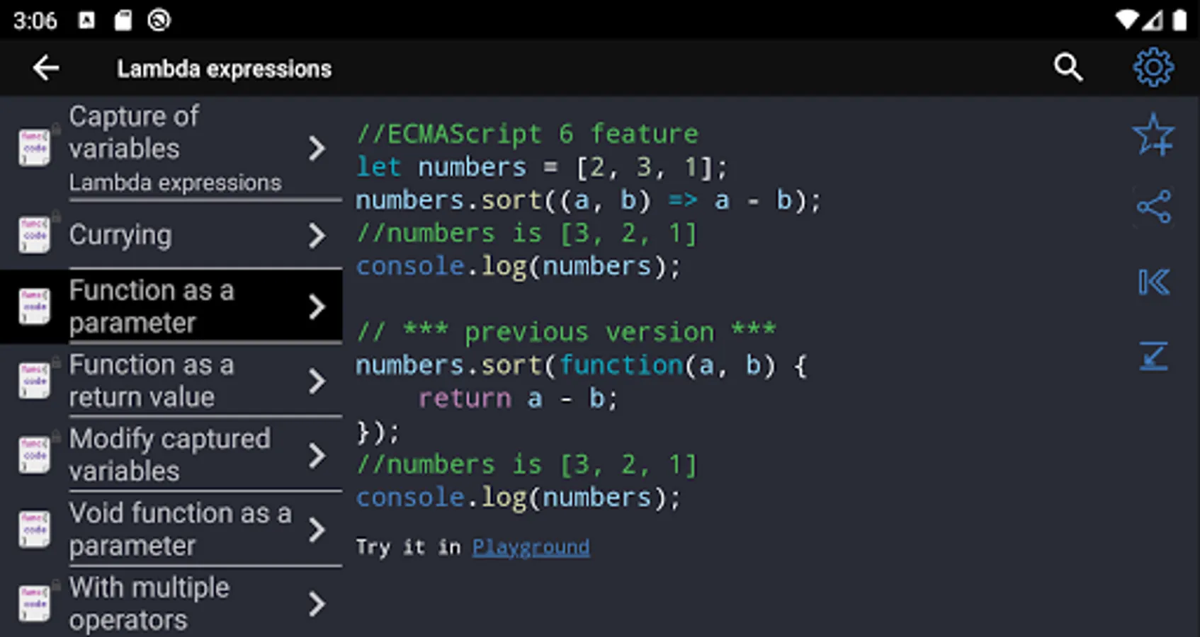 A must have app for any consultant. Rather than being a lexicon of coding descriptions and commands, as so many of these apps are, Fedor has provided a reference tool for real-world developers. There are three main areas of the app; list of topics leading to subject menu, explanation page, settings. Starting with the list of topics, the index is broken into logical sections that direct the developer quickly to a sub-menu and the area needed - precisely where a developer would expect to find what they’re looking for. The explanations in each and every page are succinct, well thought out, and clearly presented with excellent examples where needed. There is no boiler plate generic definitions here. The ‘settings’ section is equally efficient. It allows to switch to dark, change font and size, upgrade/release additional language examples, or simply upgrade to a full and ad-free version. It should be noted that the cost and features of a fully upgraded ‘Codes recipes’ app is the same as buying the ‘Codes recipes PRO’ version. Fedor, thank you for developing this app - it’s excellent.