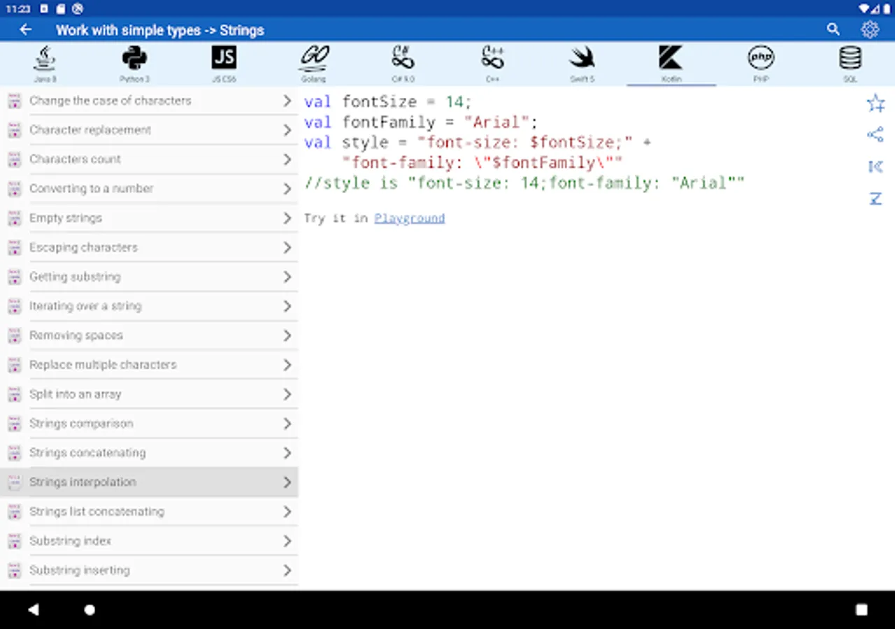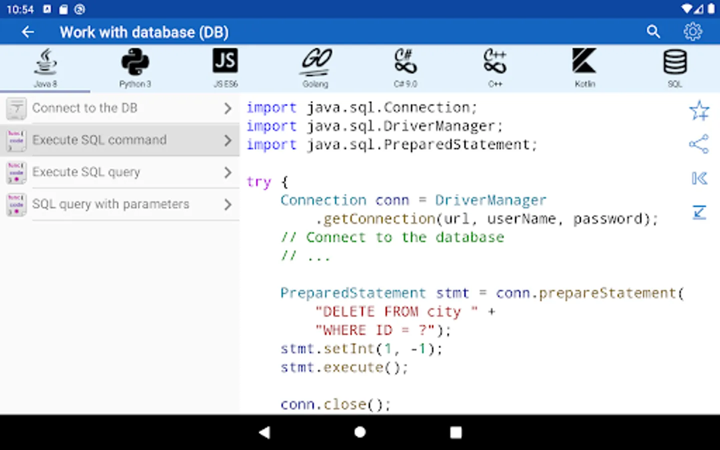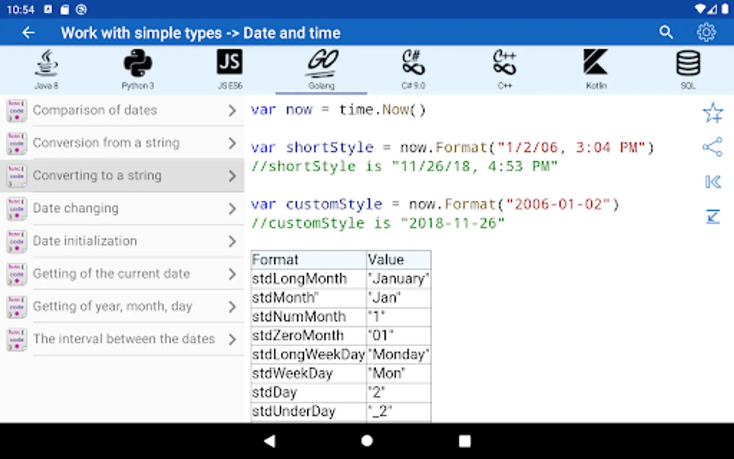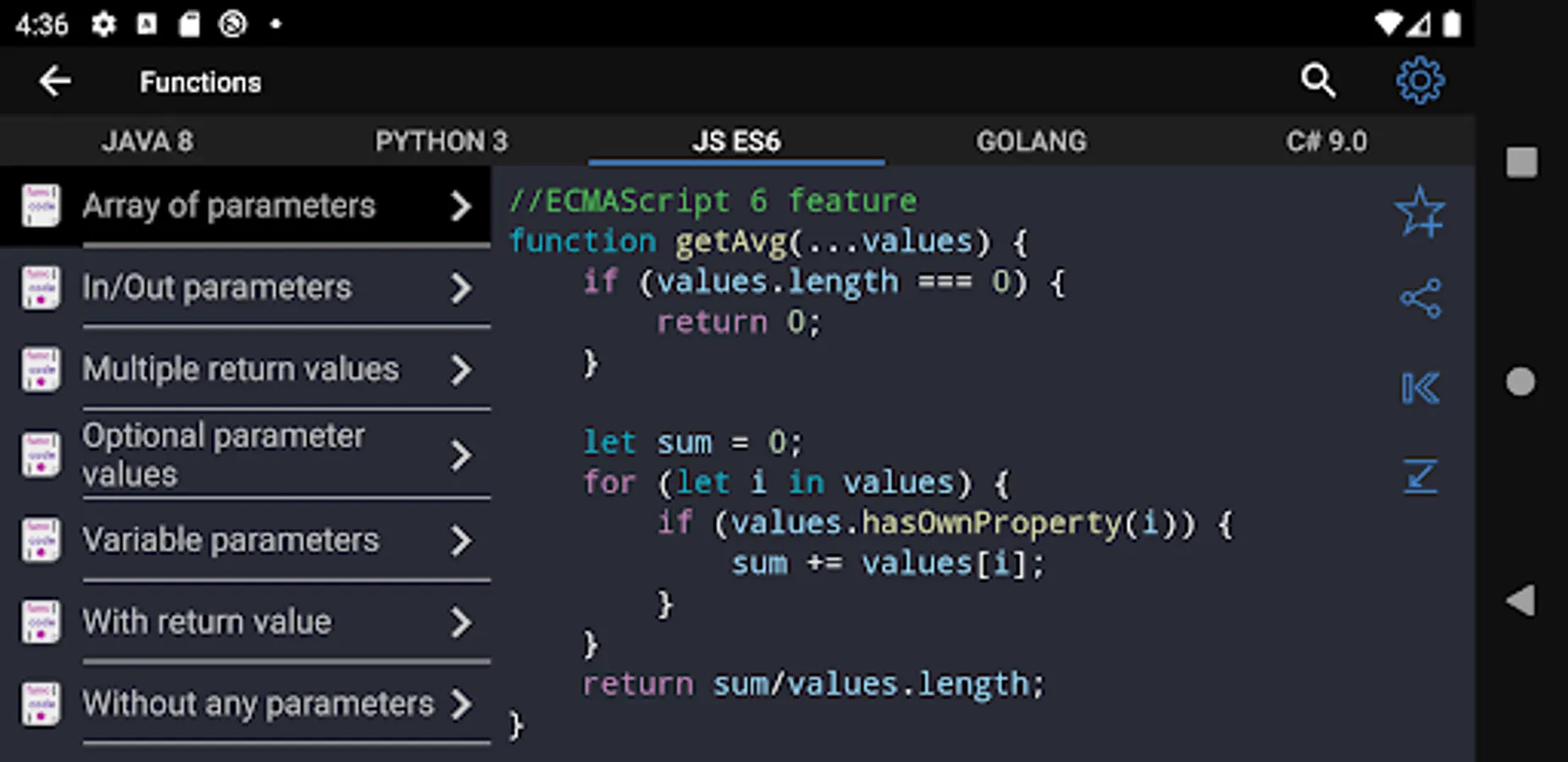 ✓ The application is a good tool during the exam or the preparation to the interview because it contains a reference to frequently used operations in different programming languages.