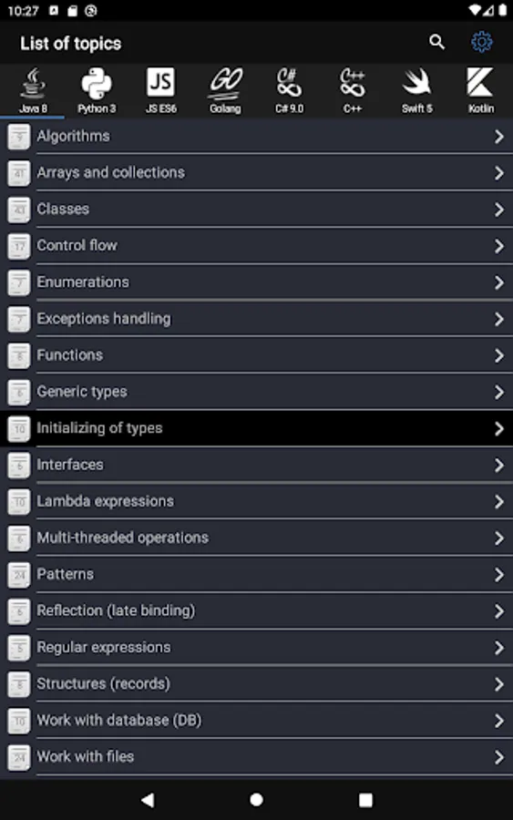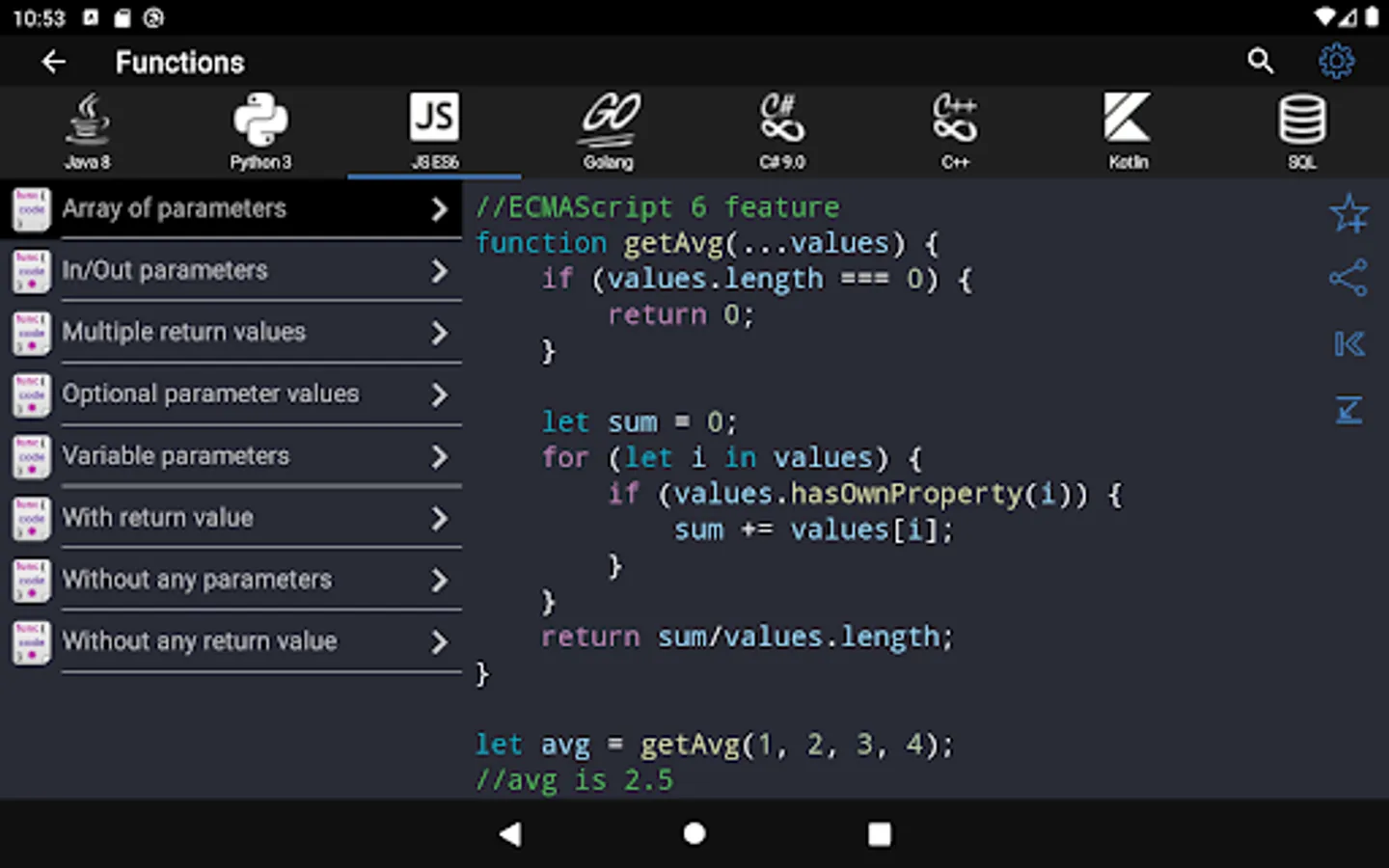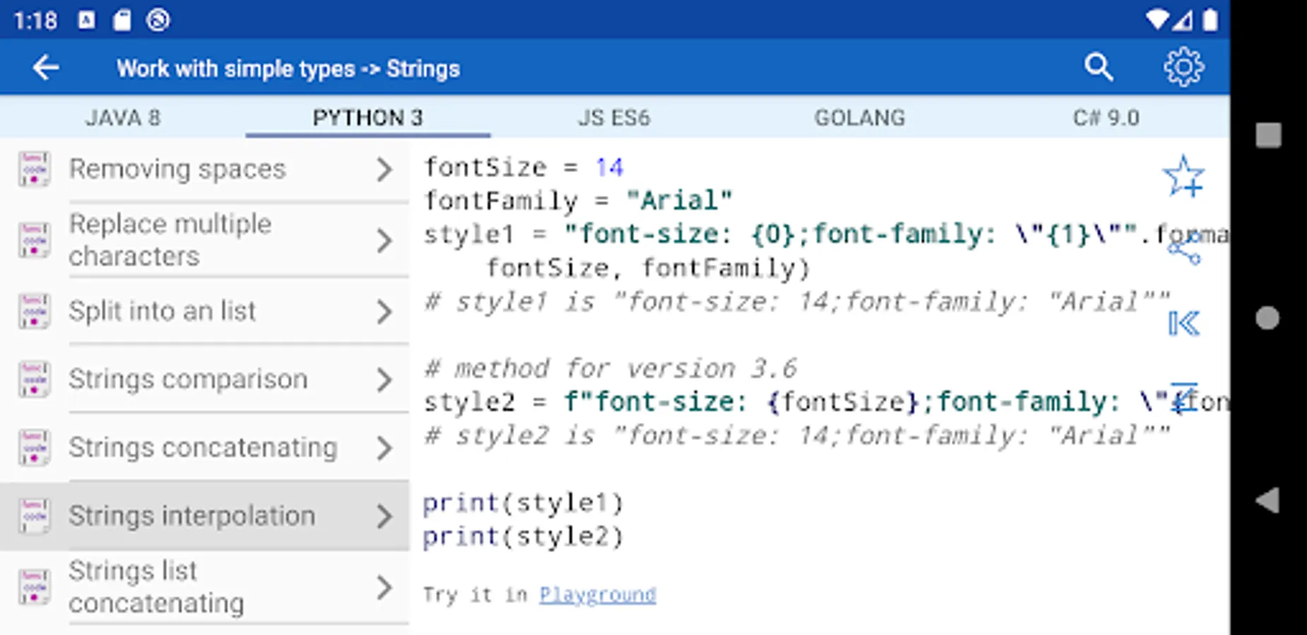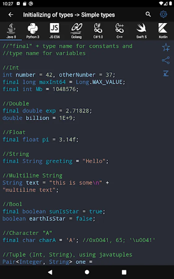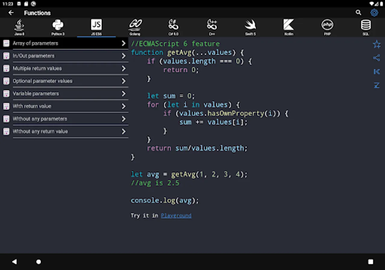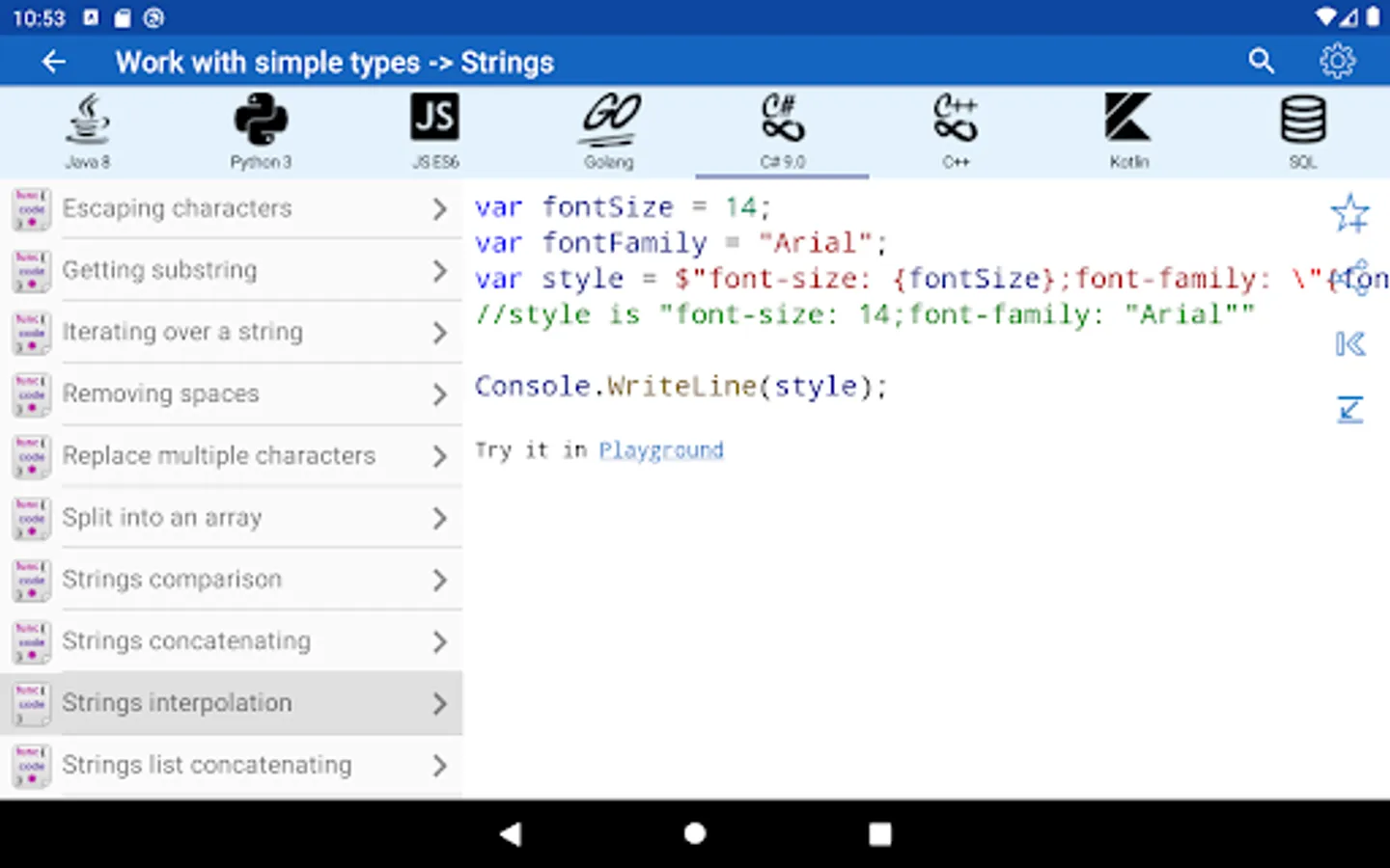 ✓ The application is a good tool during the exam or the preparation to the interview because it contains a reference to frequently used operations in different programming languages.