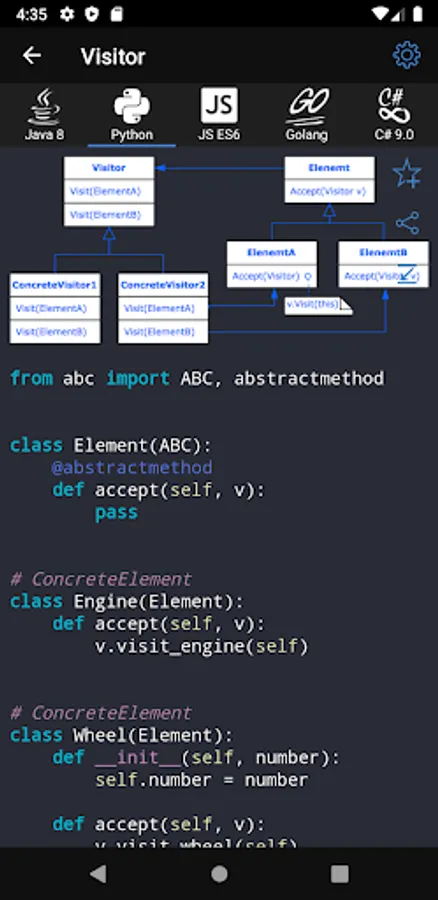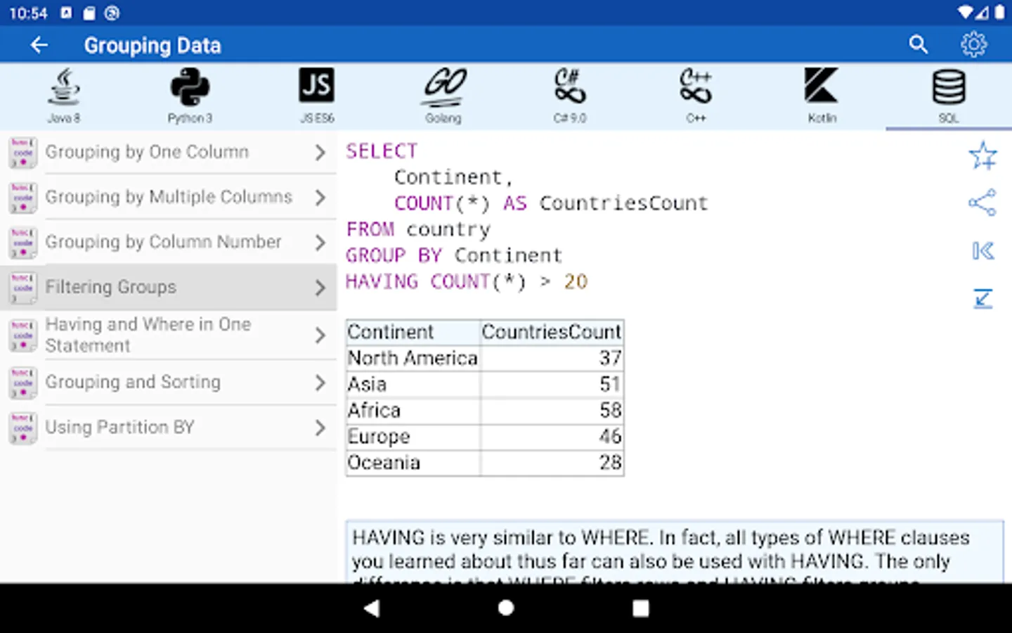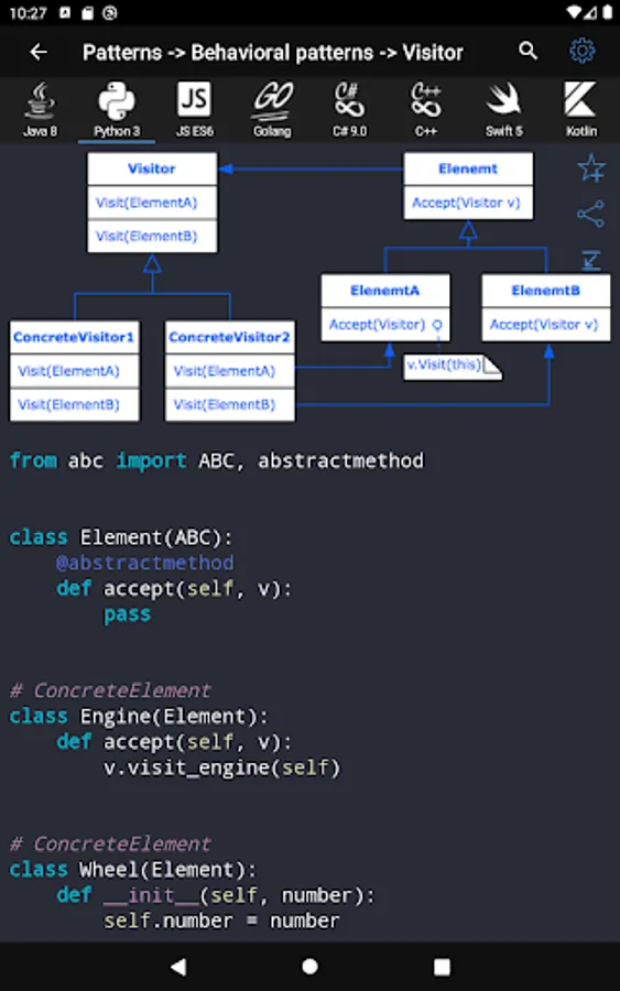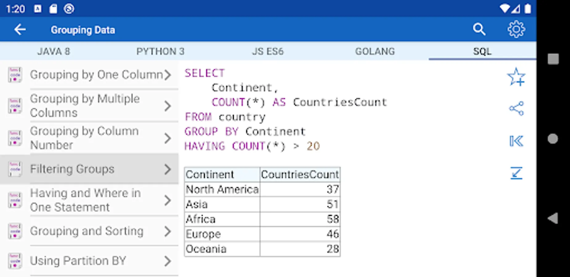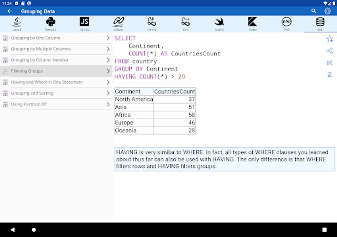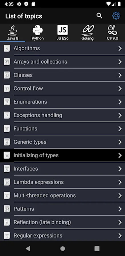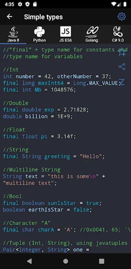 ✓ The application is a good tool during the exam or the preparation to the interview because it contains a reference to frequently used operations in different programming languages.