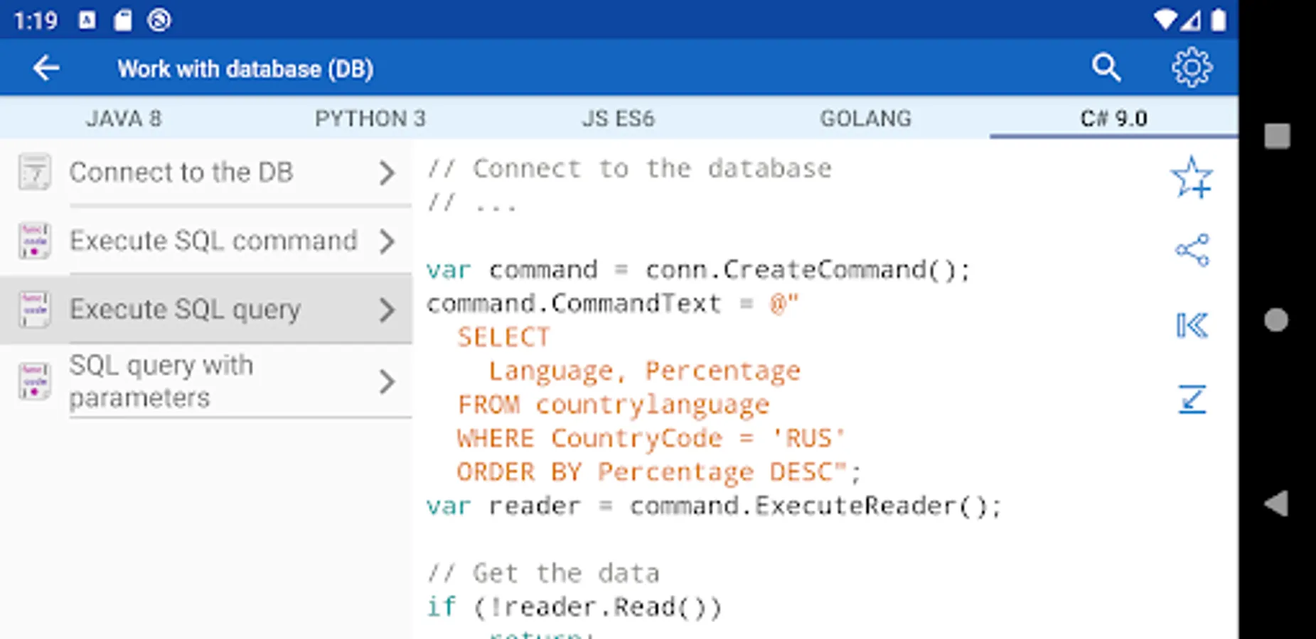 ✓ The best examples of codes from books and specific internet resources are selected in the program. Finding the best decision on the Internet may demand hours of working time. Ready for use and tested code "recipes" are included in the application