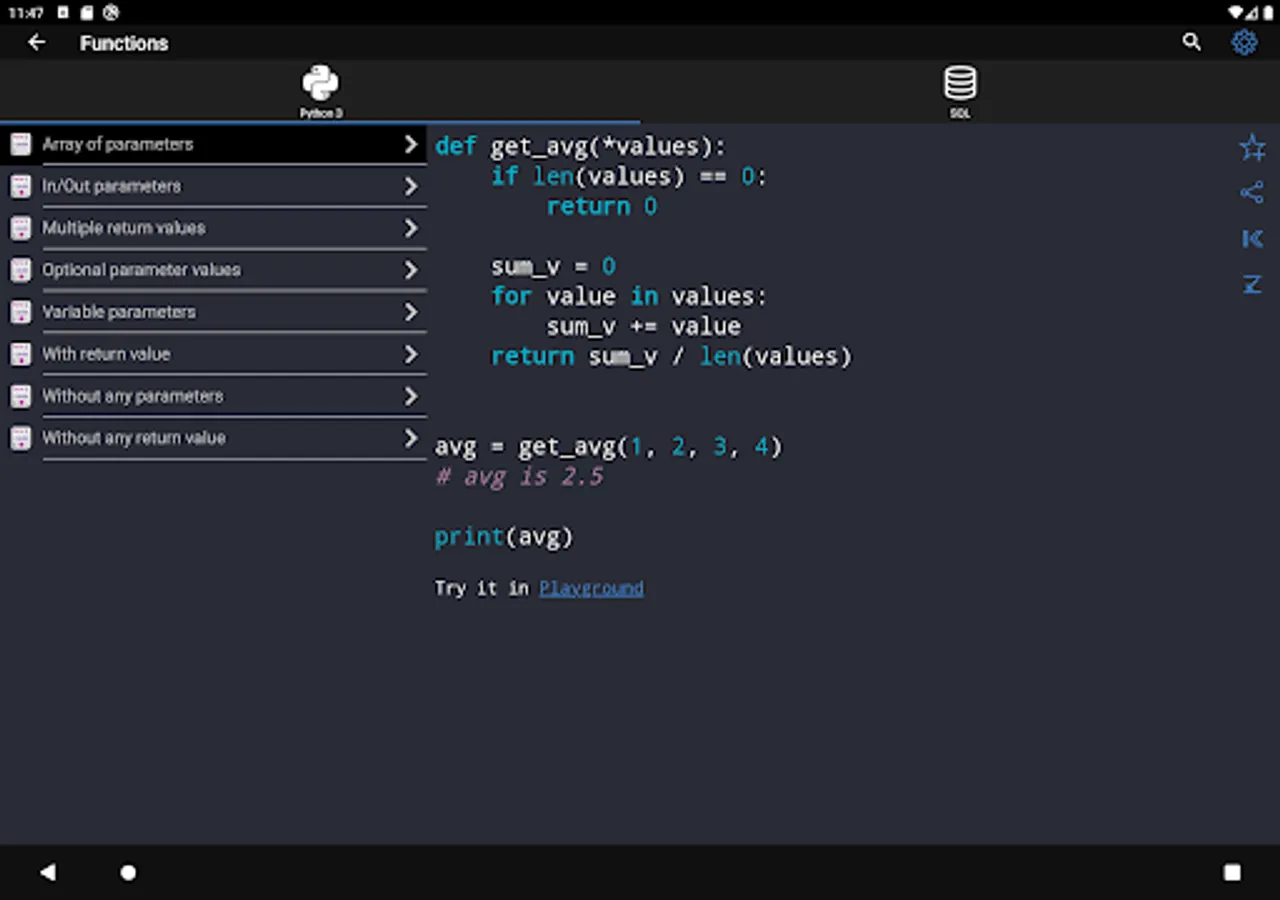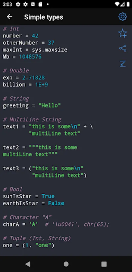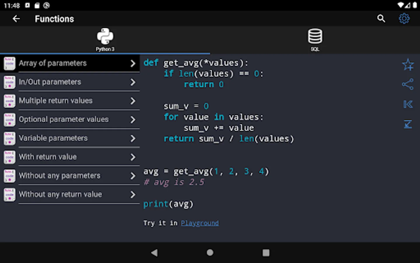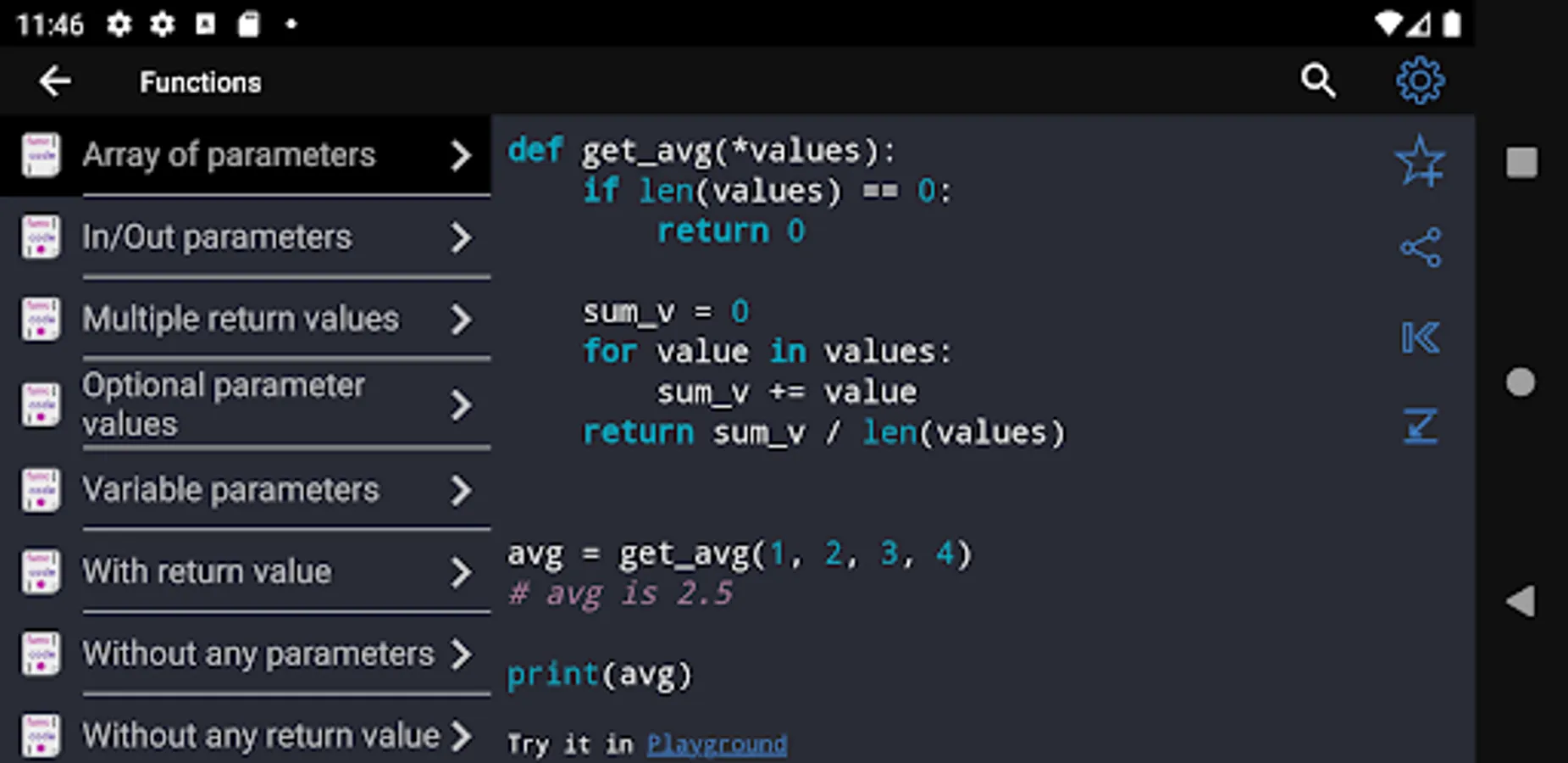 ✓ You don`t know which programming language to choose? The application can compare syntax from every example in different programming languages and make a balanced decision during choosing a programming language.