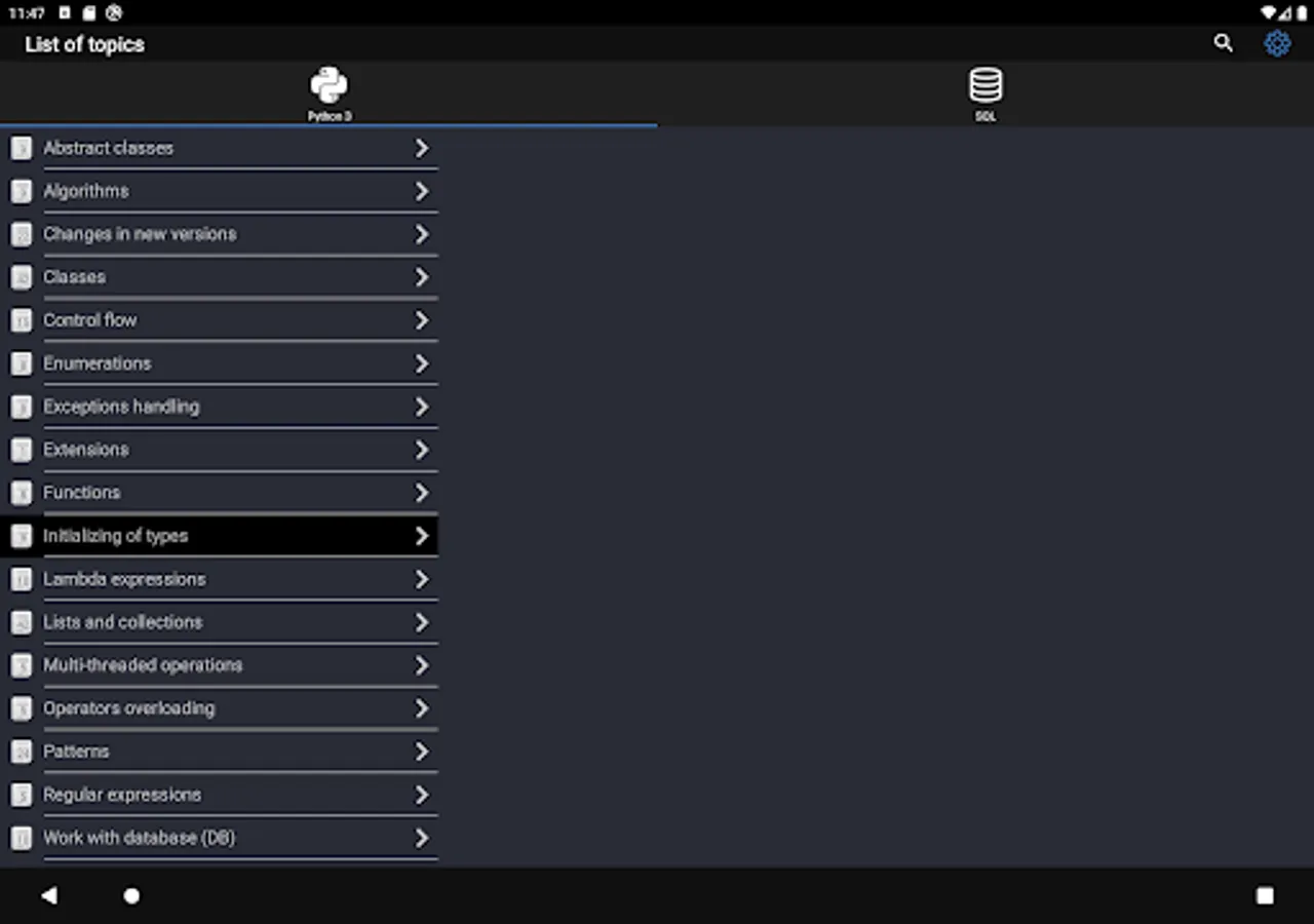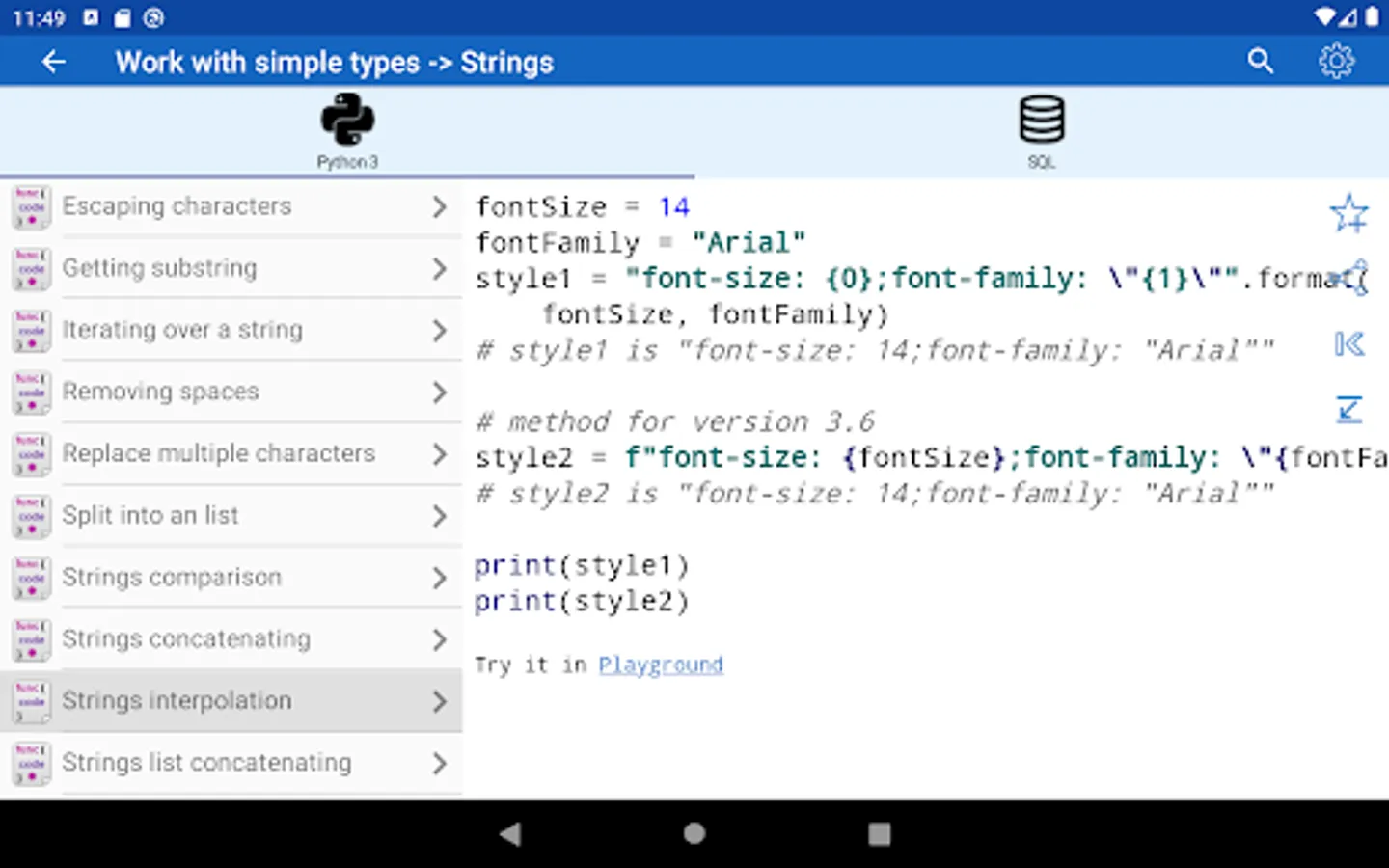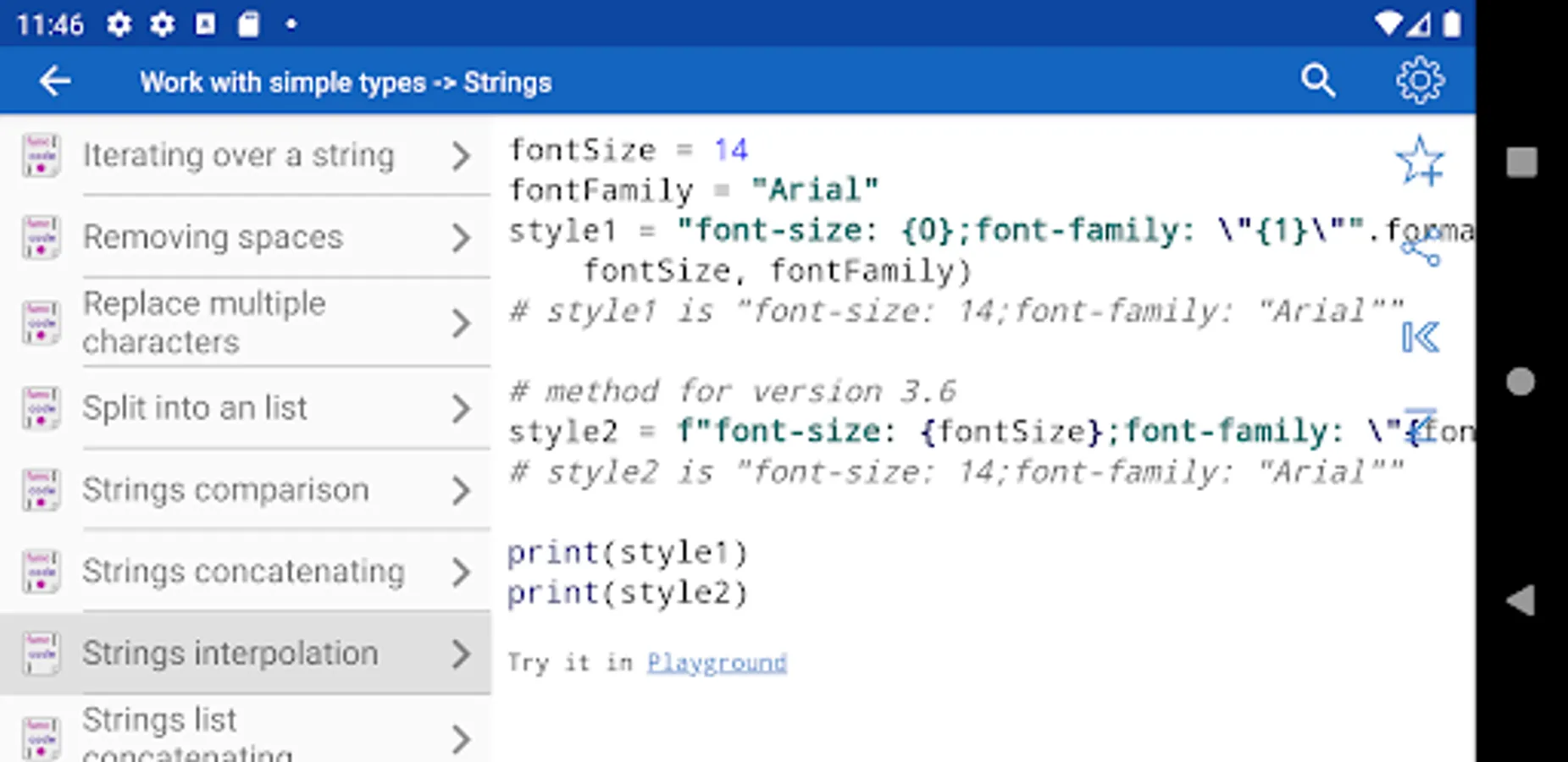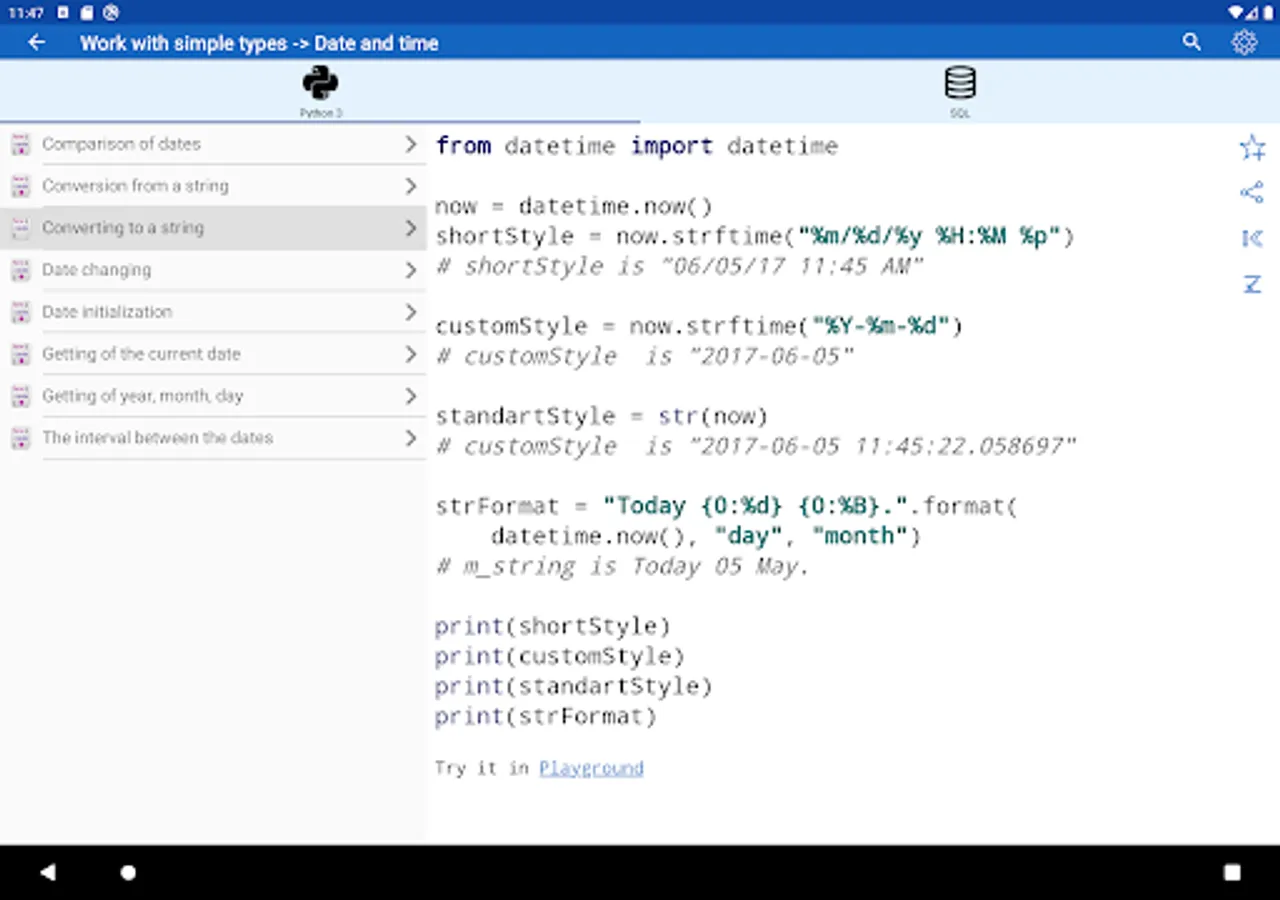 ✓ The application is a good tool during the exam or the preparation to the interview because it contains a reference to frequently used operations in different programming languages.