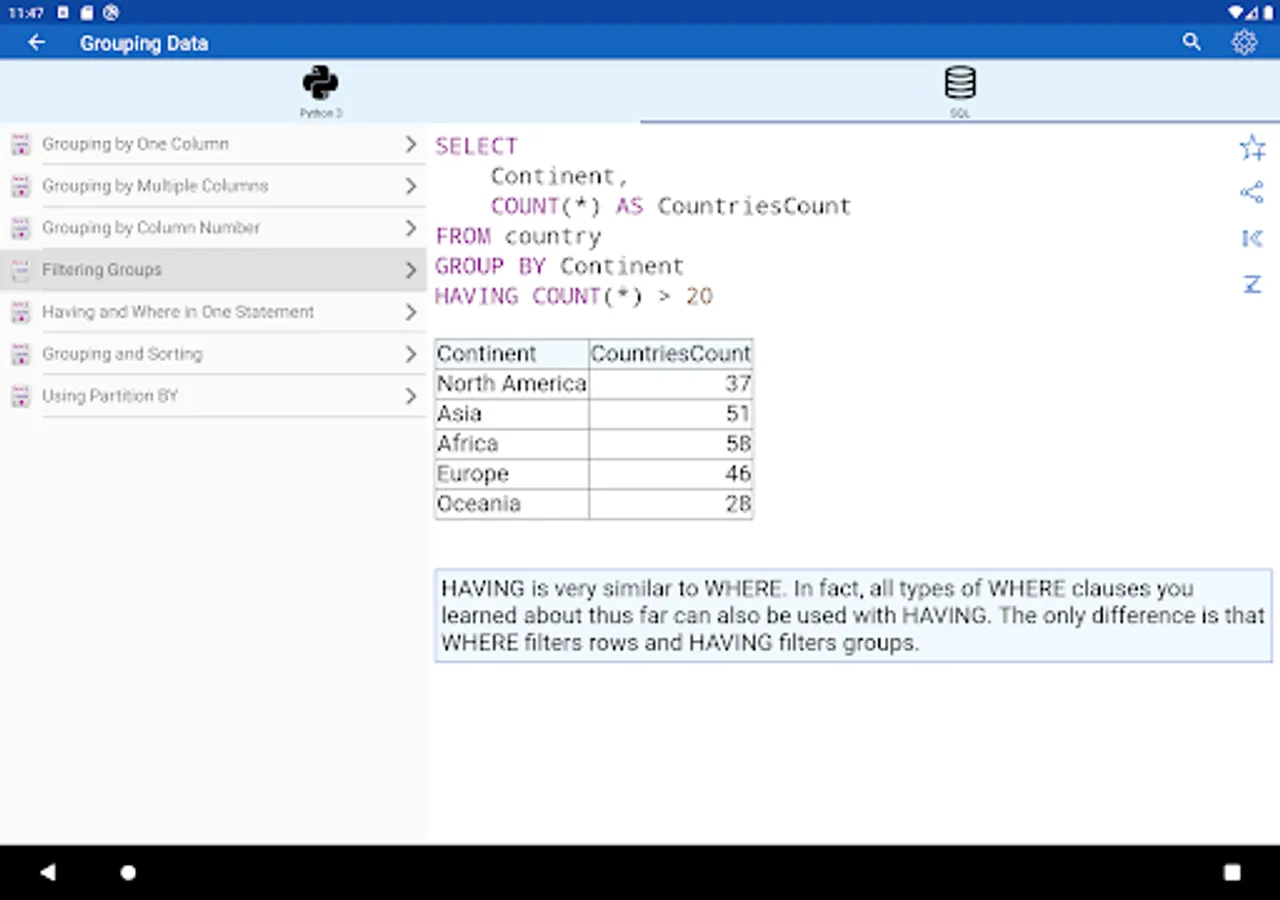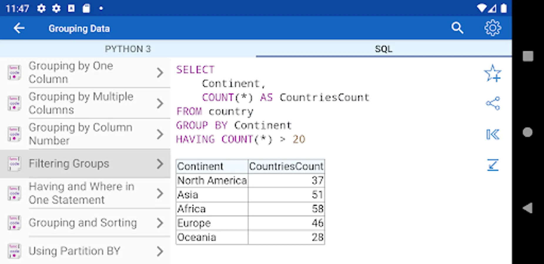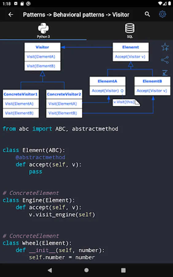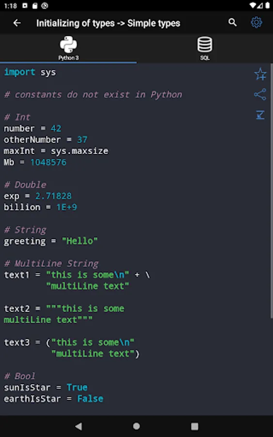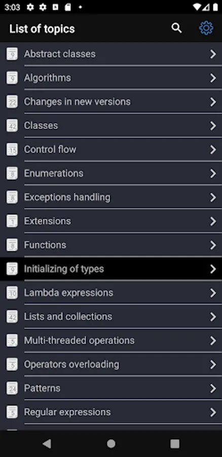 ✓ The application is a good tool during the exam or the preparation to the interview because it contains a reference to frequently used operations in different programming languages.