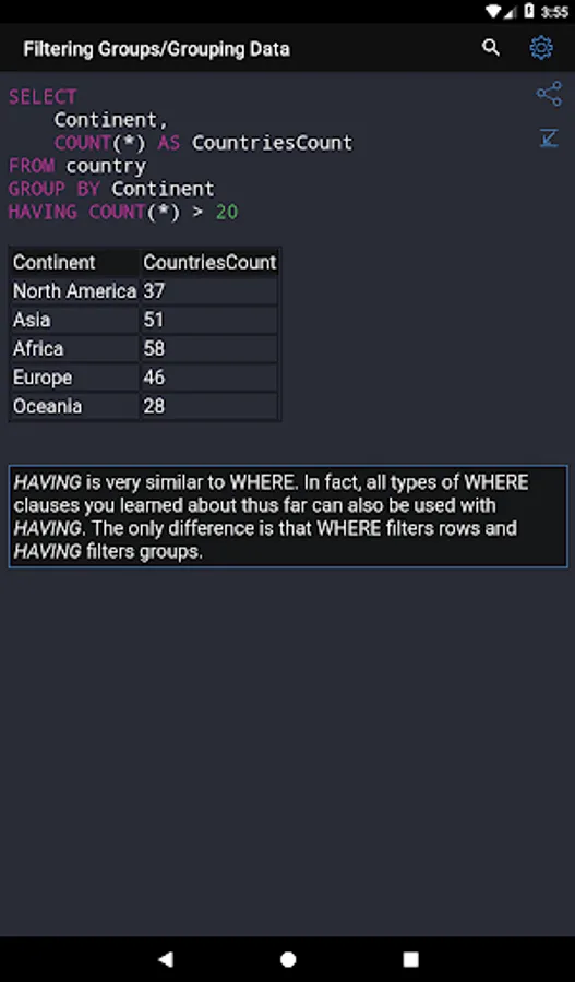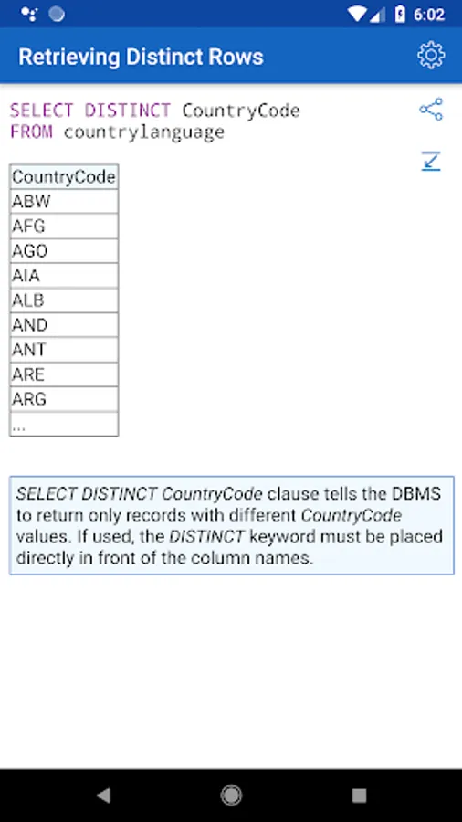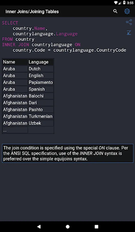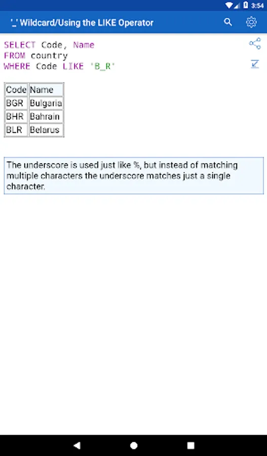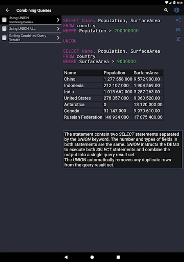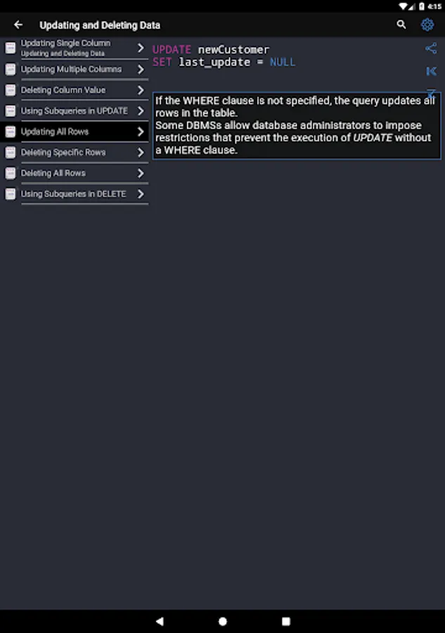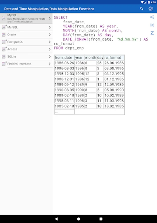 ✓ The application is a good tool during the exam or the preparation to the interview because it contains a reference to frequently used operations in SQL.