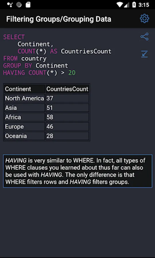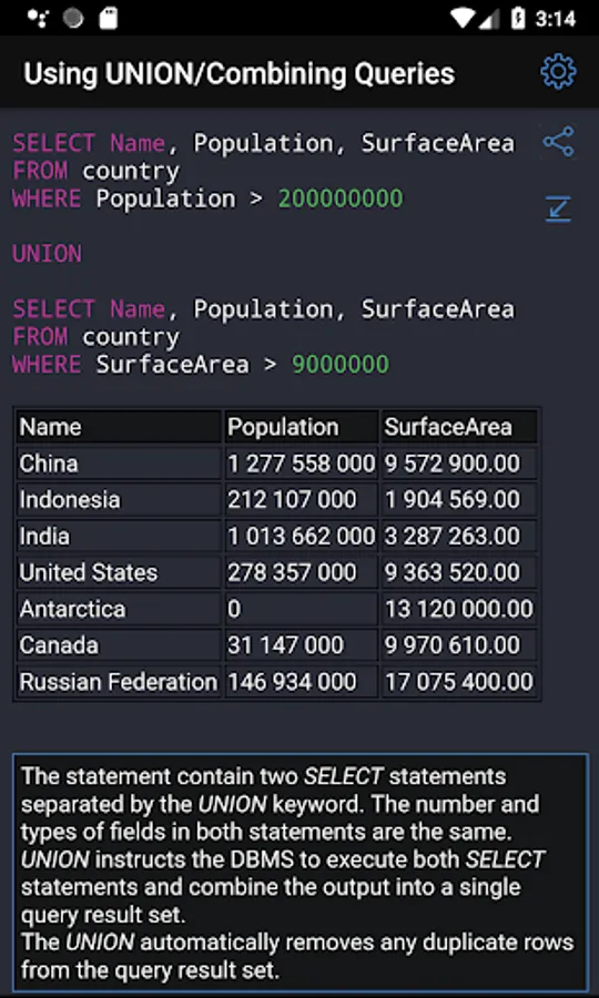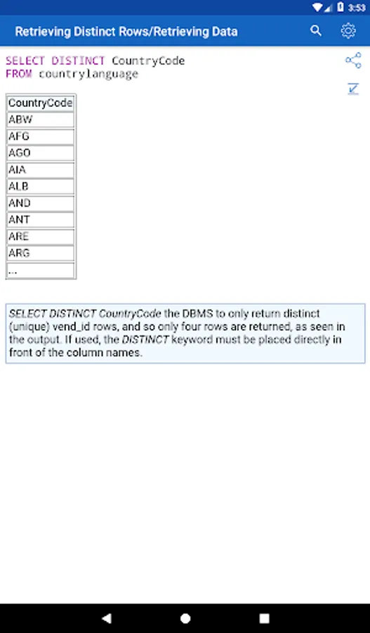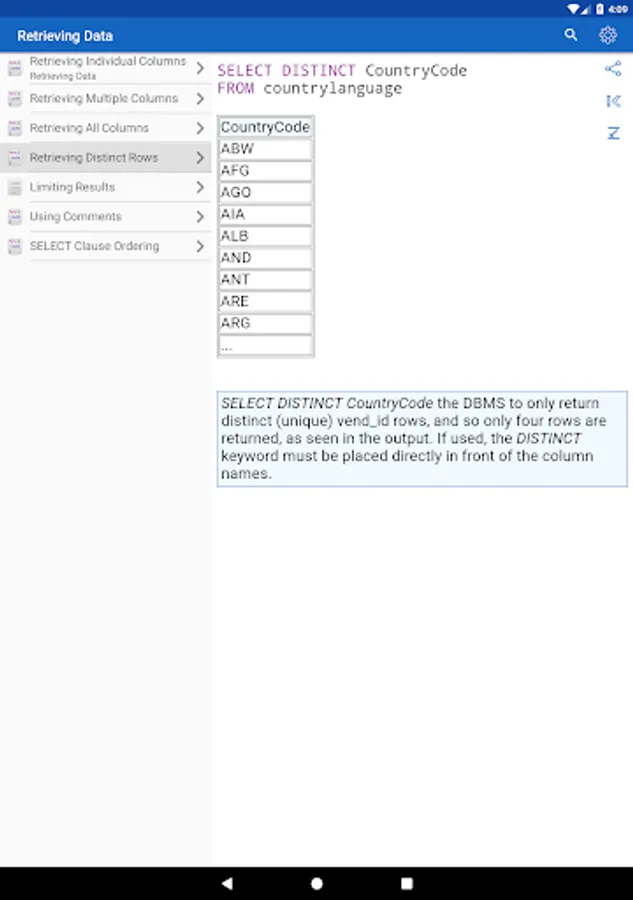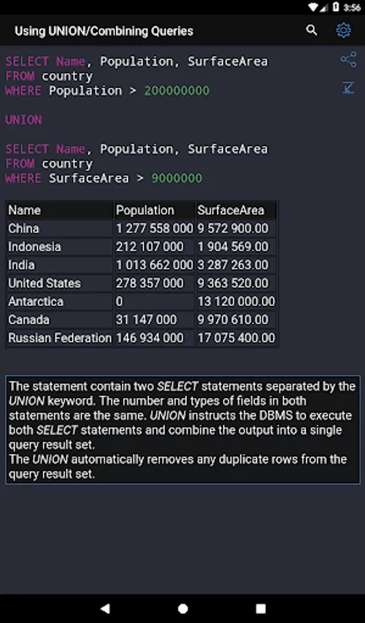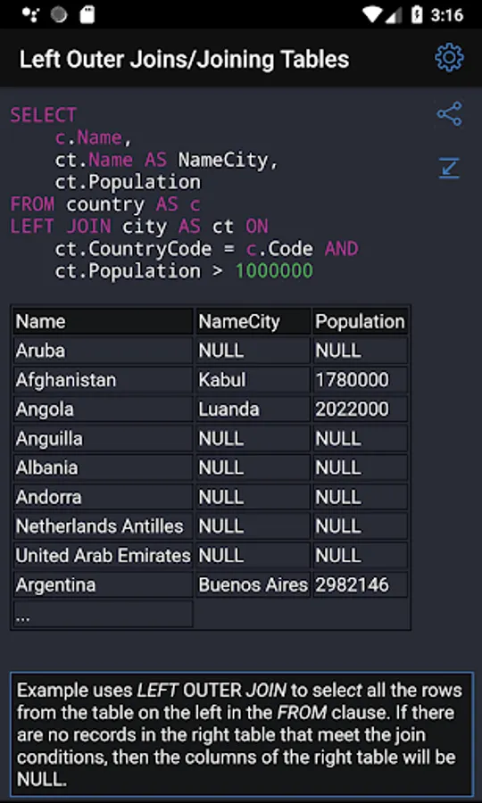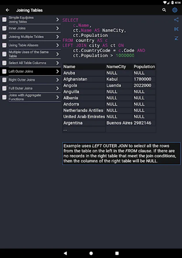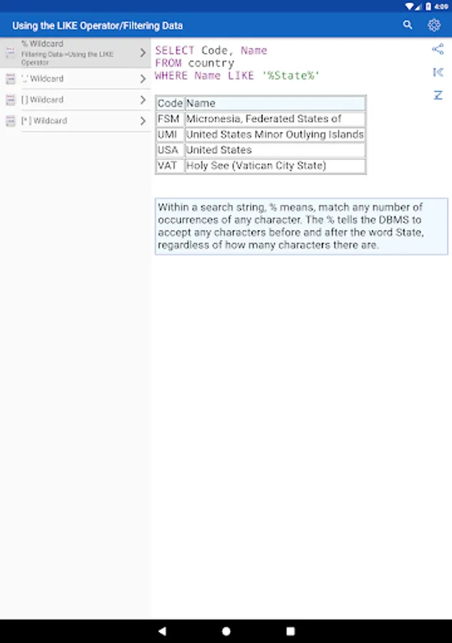 ✓ The application is a good tool during the exam or the preparation to the interview because it contains a reference to frequently used operations in SQL.