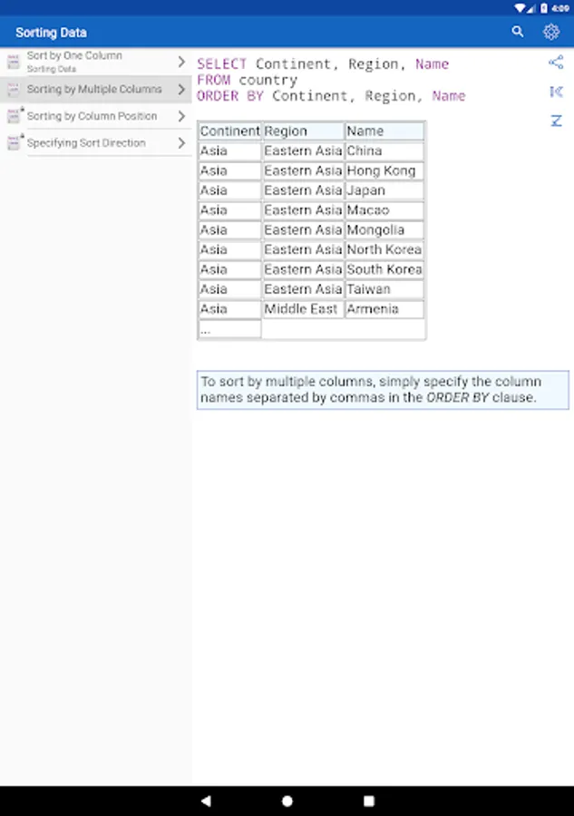 ✓ Learning SQL syntax on specific code examples. How to combine multiple tables in a single query? How to sort the result of grouping data? What types of data are there in SQL Server? These and over 150 of other code samples for SQL are available in the application.
