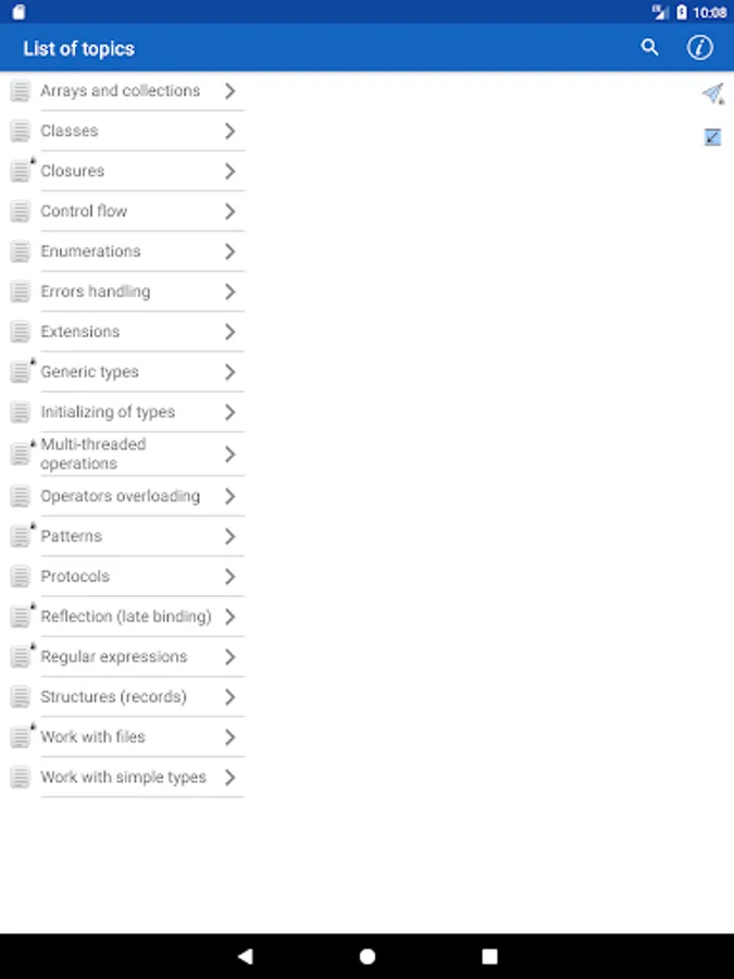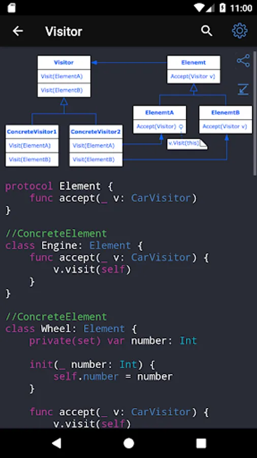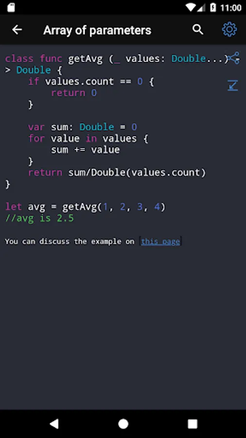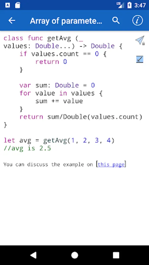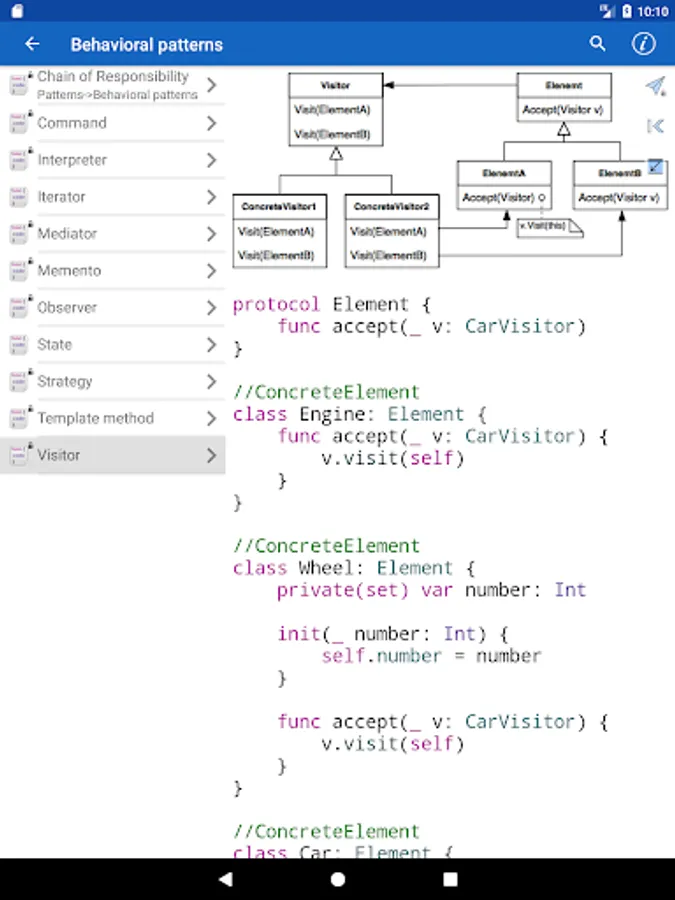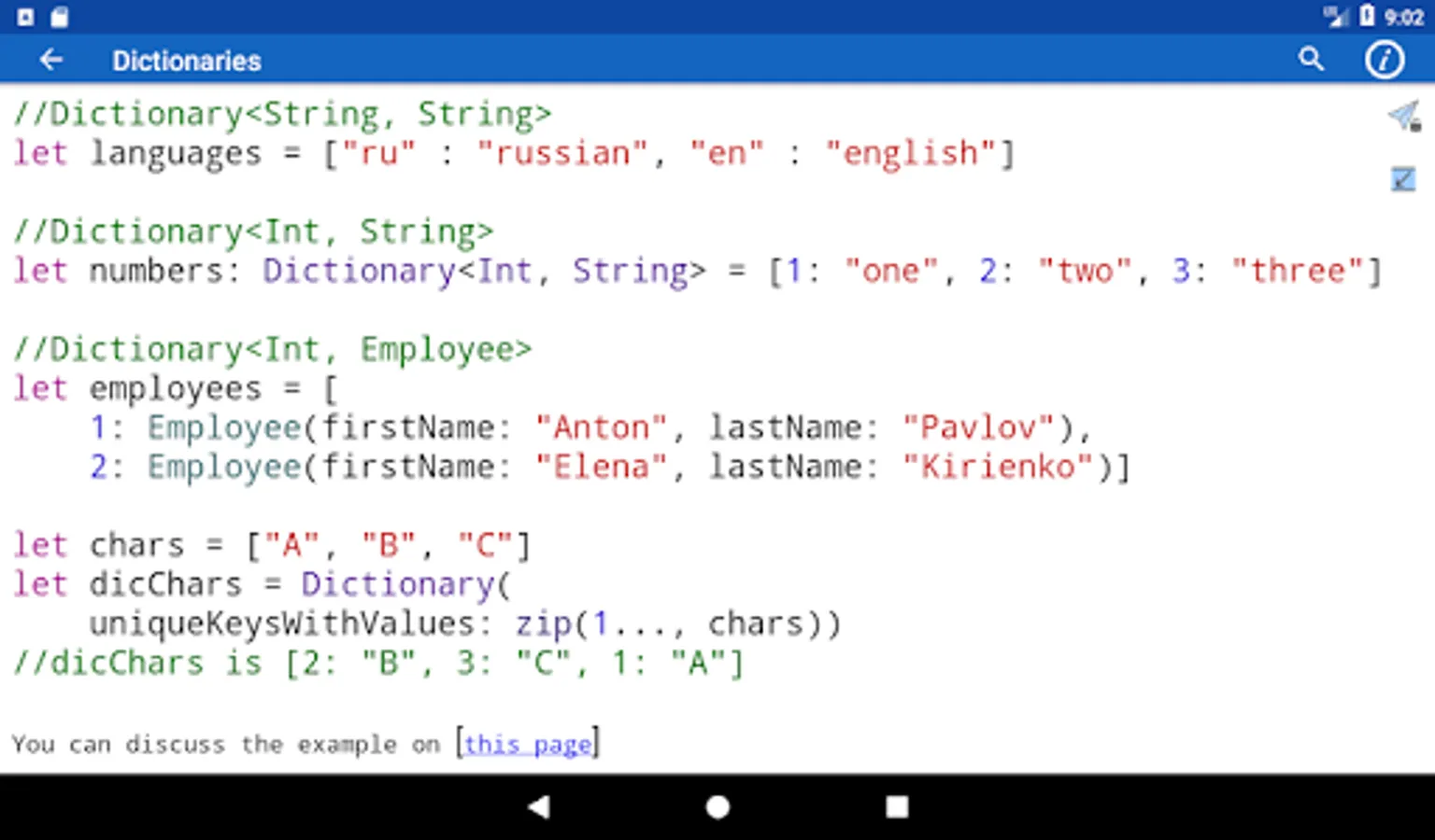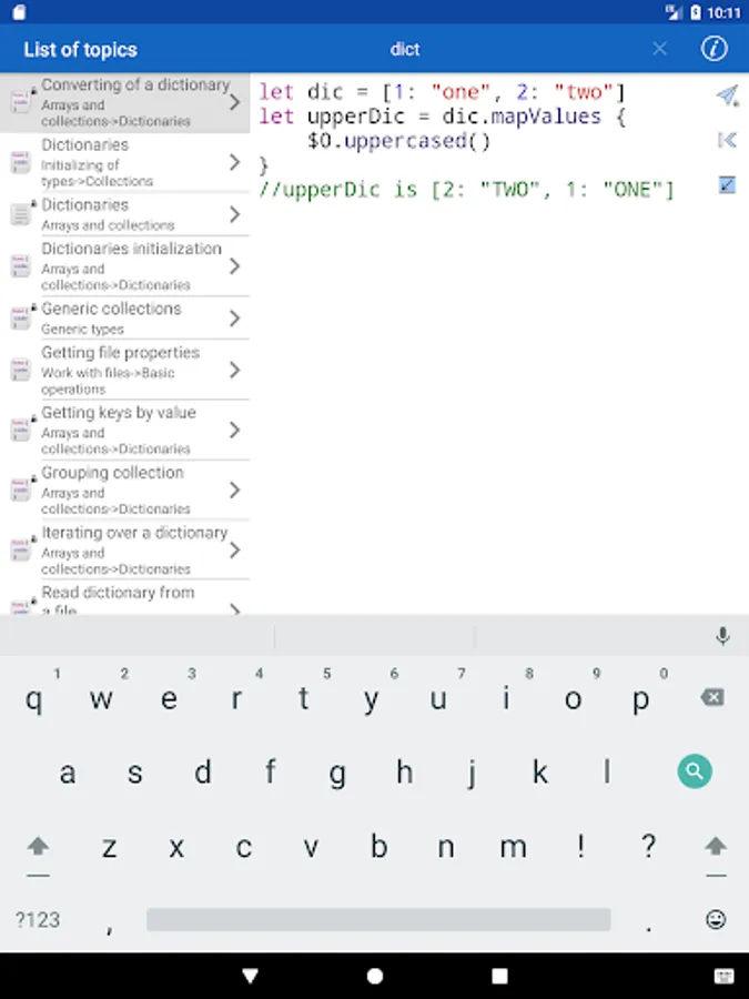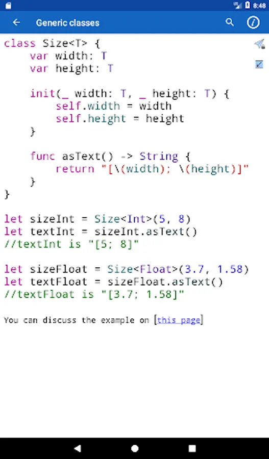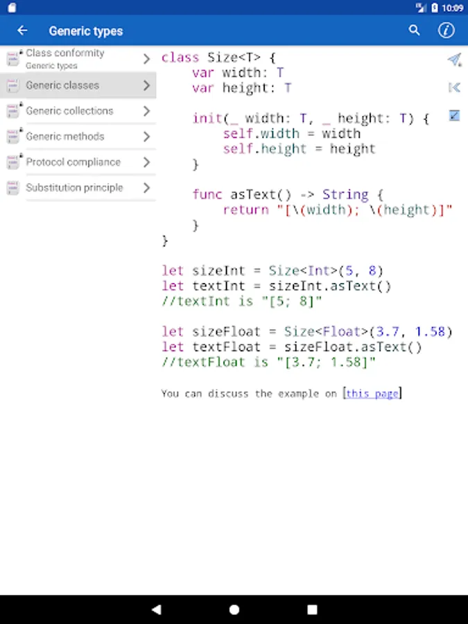 Learning Swift syntax on specific code examples. How to get a substring? How to declare a generalized method? These and over 250 of other code samples for Swift are available in the application.