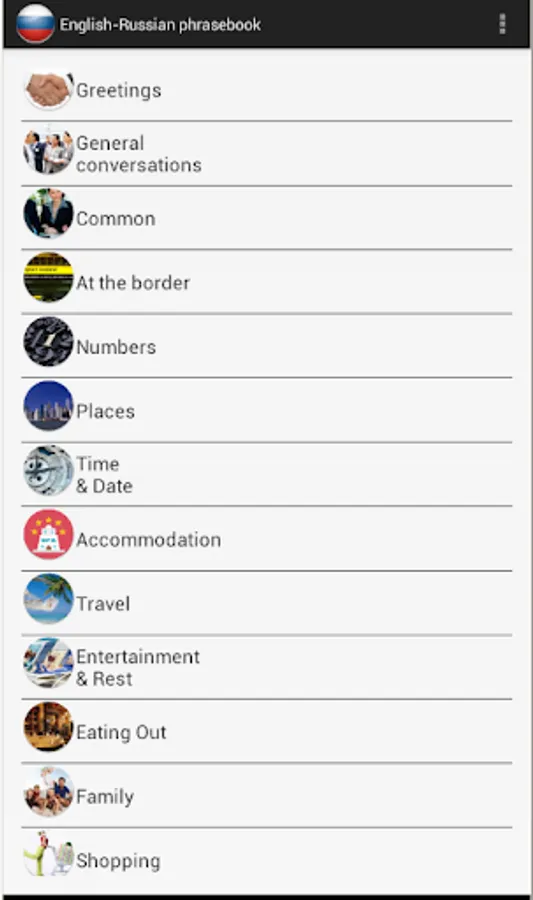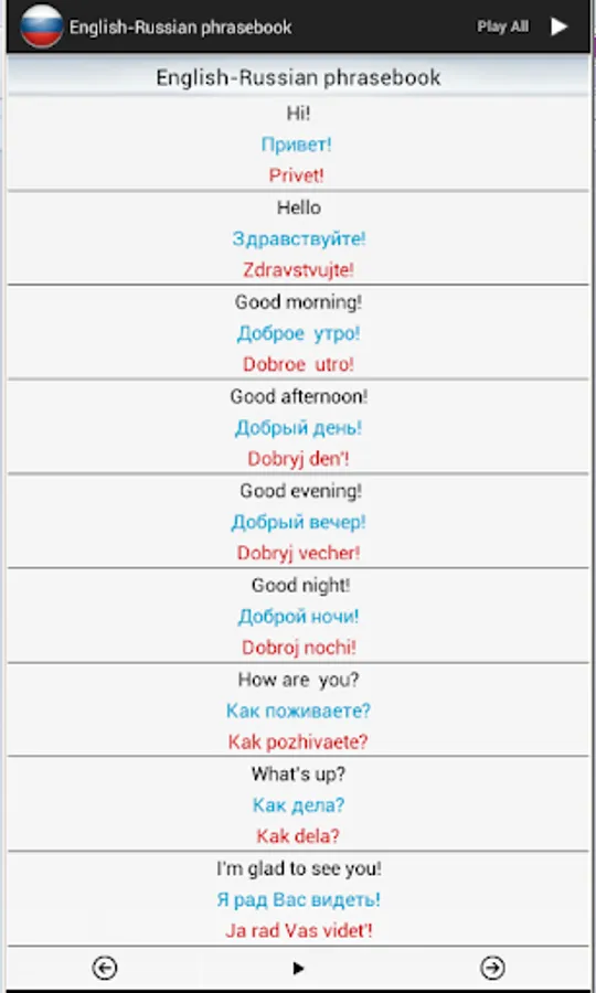 • Over 1000 essential phrases translated in Russian with phonetic transliteration and audio.