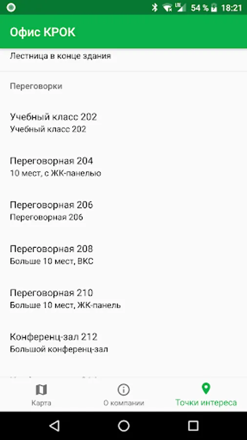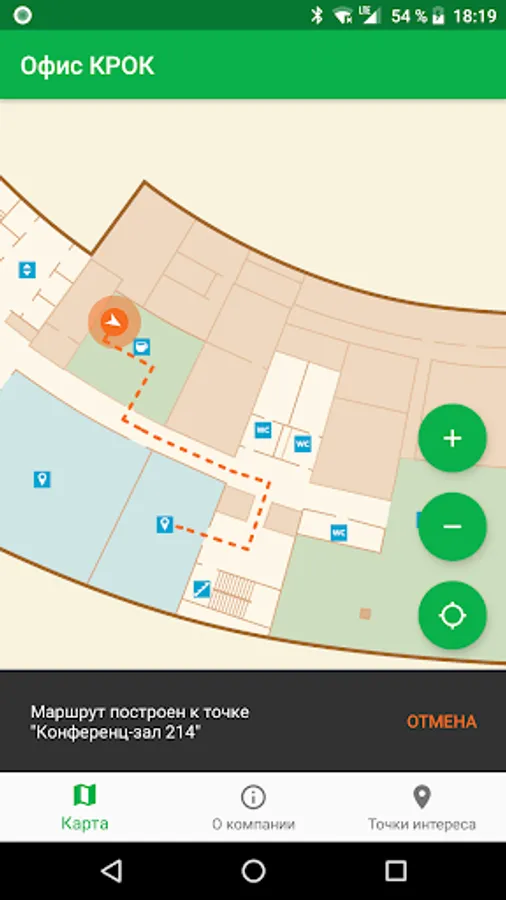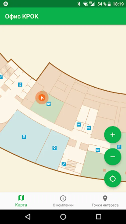 CROC Office application showcases features of positioning modules built-in on almost any up-to-date mobile phone, by the example of a demo zone on the second floor of CROC's central office. Room navigation is based on a network of immovable beacons transmitting low energy Bluetooth signals. CROC Office application determines user phone location inside the building in real time by evaluating the power of these signals using trilateration algorithm and other available data sources such as readings of built-in accelerometer.