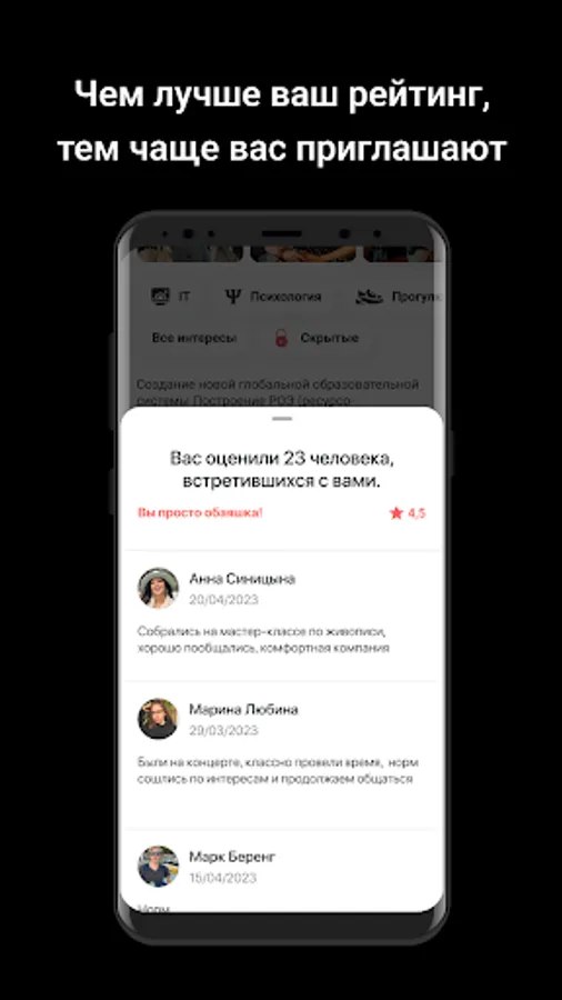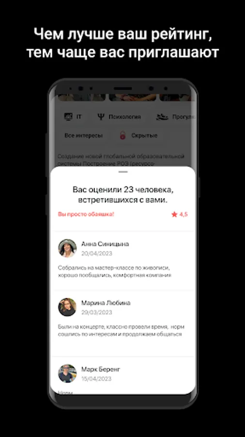 In addition, the application generates user ratings that will help you find the best partners for your events. You can indicate your interests in your profile, rate other event attendees, and chat in event chats within the app.