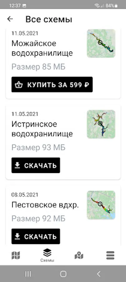 The application is free. To download new reservoirs, click the "Schemes" button, then the "Download more" button, select an area, a reservoir and click the "Download" button (for a paid depth scheme there will be a "Buy" button).