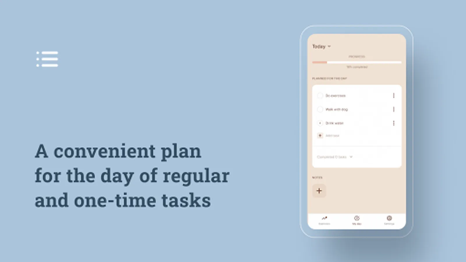 - To-Do list of one-time and regular tasks (habit tracker);
