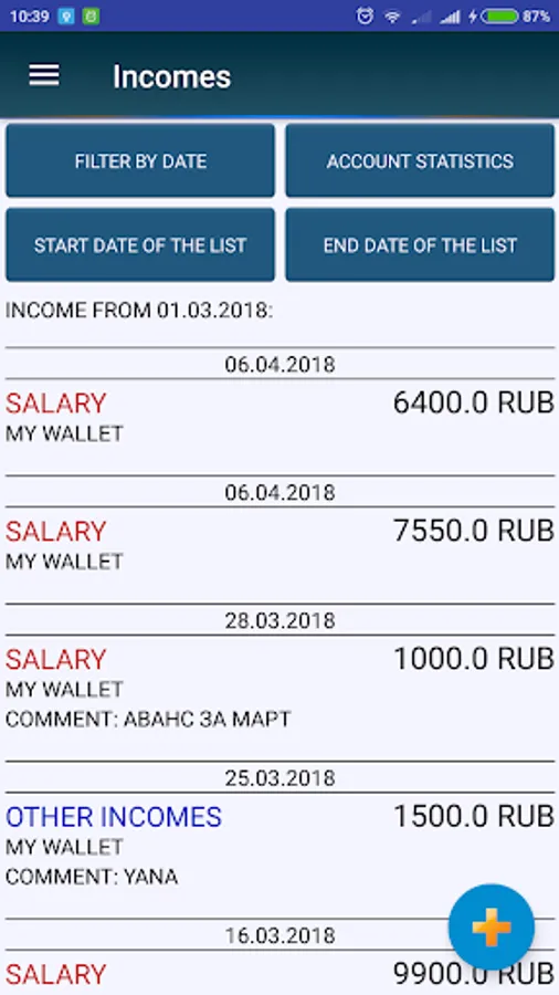 3. Earnings - do not forget to enter income in the application to keep the balance of accounts up-to-date.