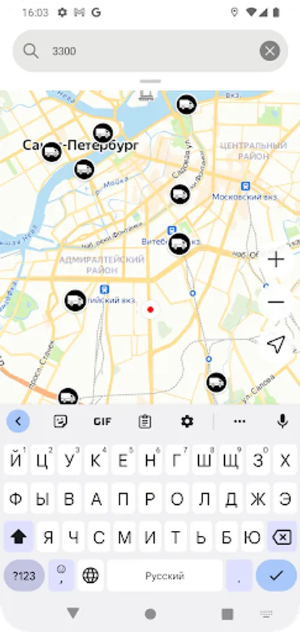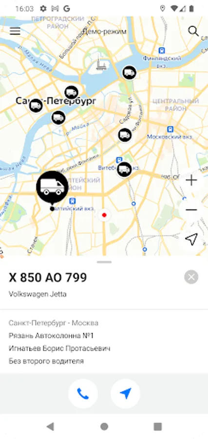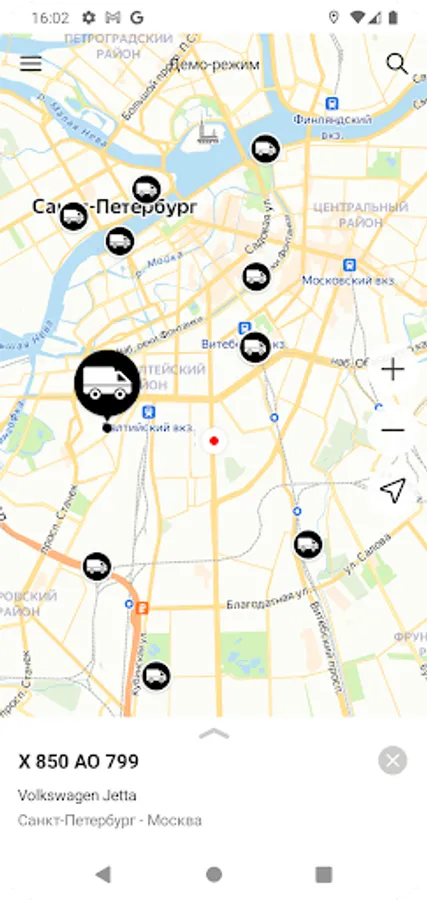 • Search by state or garage number (depending on what is visible / readable), displaying the found car with a marker on the map.