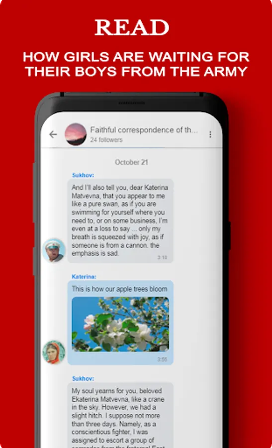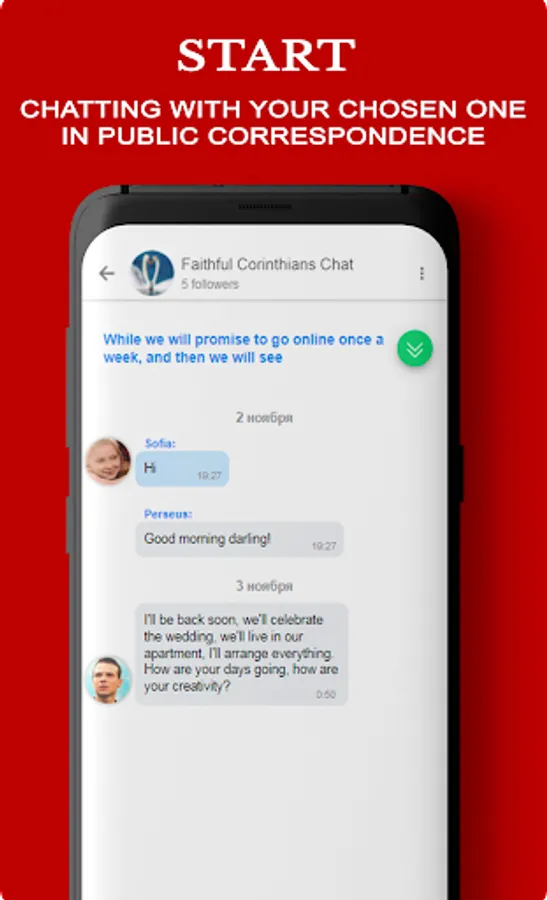 User can create a couple chat with a girl who is waiting for her boyfriend to return home. To support the girl while the guy is in the army, the couple is invited to write promises to each other and fulfill these conversations to build faithful love. For example, go online and tell as a mood. If one of the partners did not fulfill the promise, then it is proposed to apologize and promise something new. Other people can read the correspondence and give gifts to support their union and help until the prudential retirement if chat is not private.