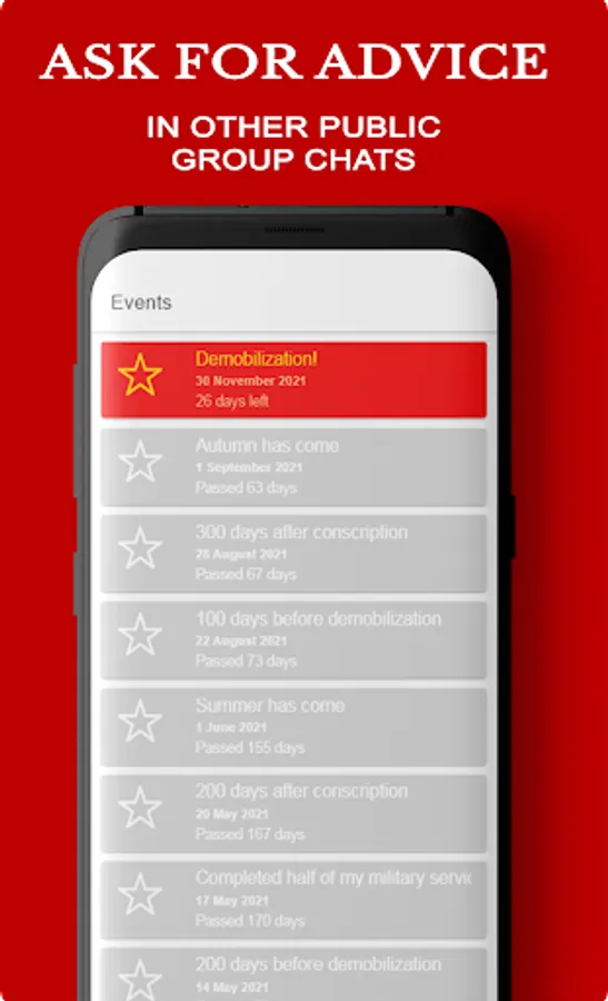 App is useful in cases where a person is serving in the army and he needs to plan the days until the end of military service, vacation, trip, cruise, wedding, birthday, halloween, final deadline.