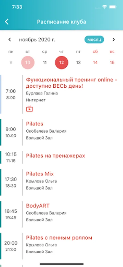 - schedule of group trainings of the club;