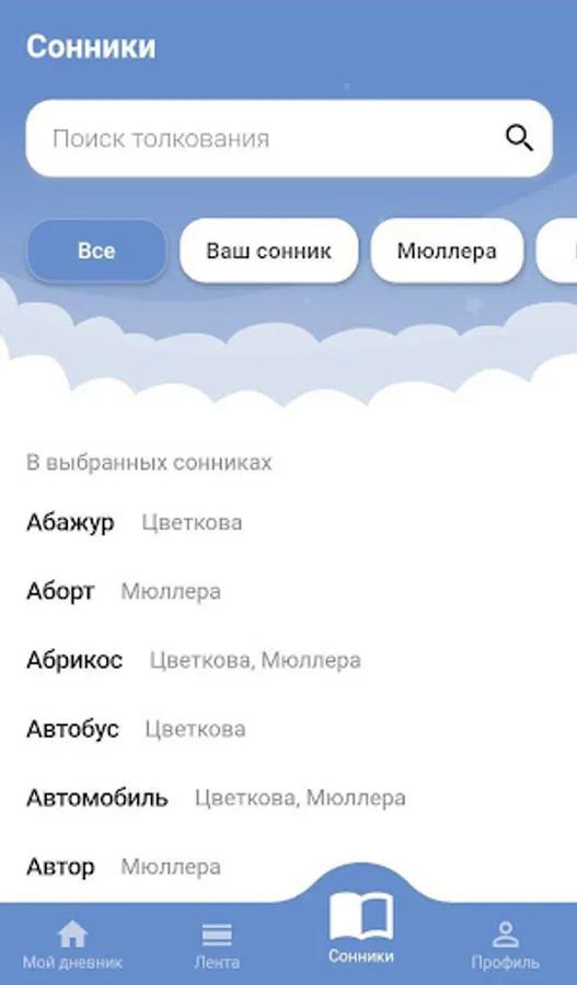 At the moment, the application “My Dreams - Network of Dreams” is based on the works of Gustav Hindman Miller, Wang, Yevgeny Tsvetkov, David Loff, Sigmund Freud, Schiller-Schoolboy, medium Miss Hasse. What sleep means, you can determine using about 10,000 interpretations from different dream books.