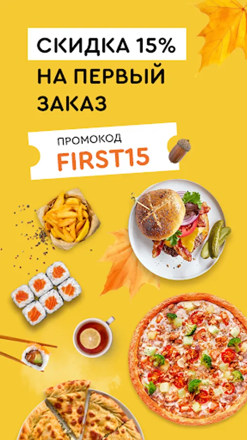 • the first delivery of sushi, wok or pizza comes with a gift - 15% discount;
