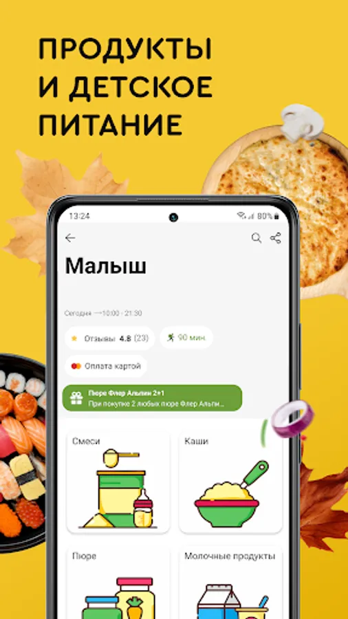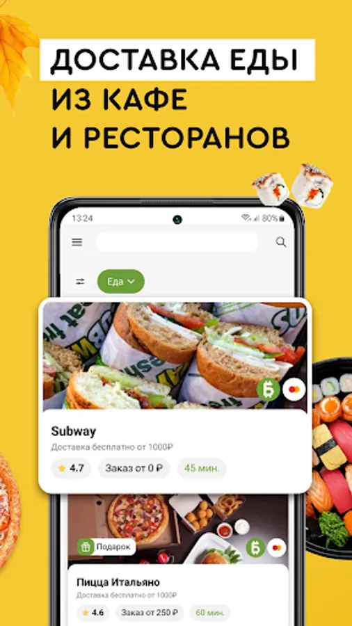 With the Edostav application, you don’t have to depend on the assortment of nearby stores, cafes and shawarma shops. With it, you can always choose only the best offers and save even more through promotional codes and promotions. And there are no service charges!