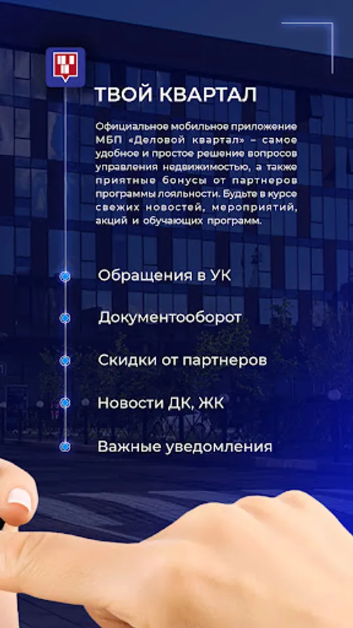 "Your Quarter" is a mobile application of the IBP "Business Quarter". Office management. News. Discounts and promotions of partners.